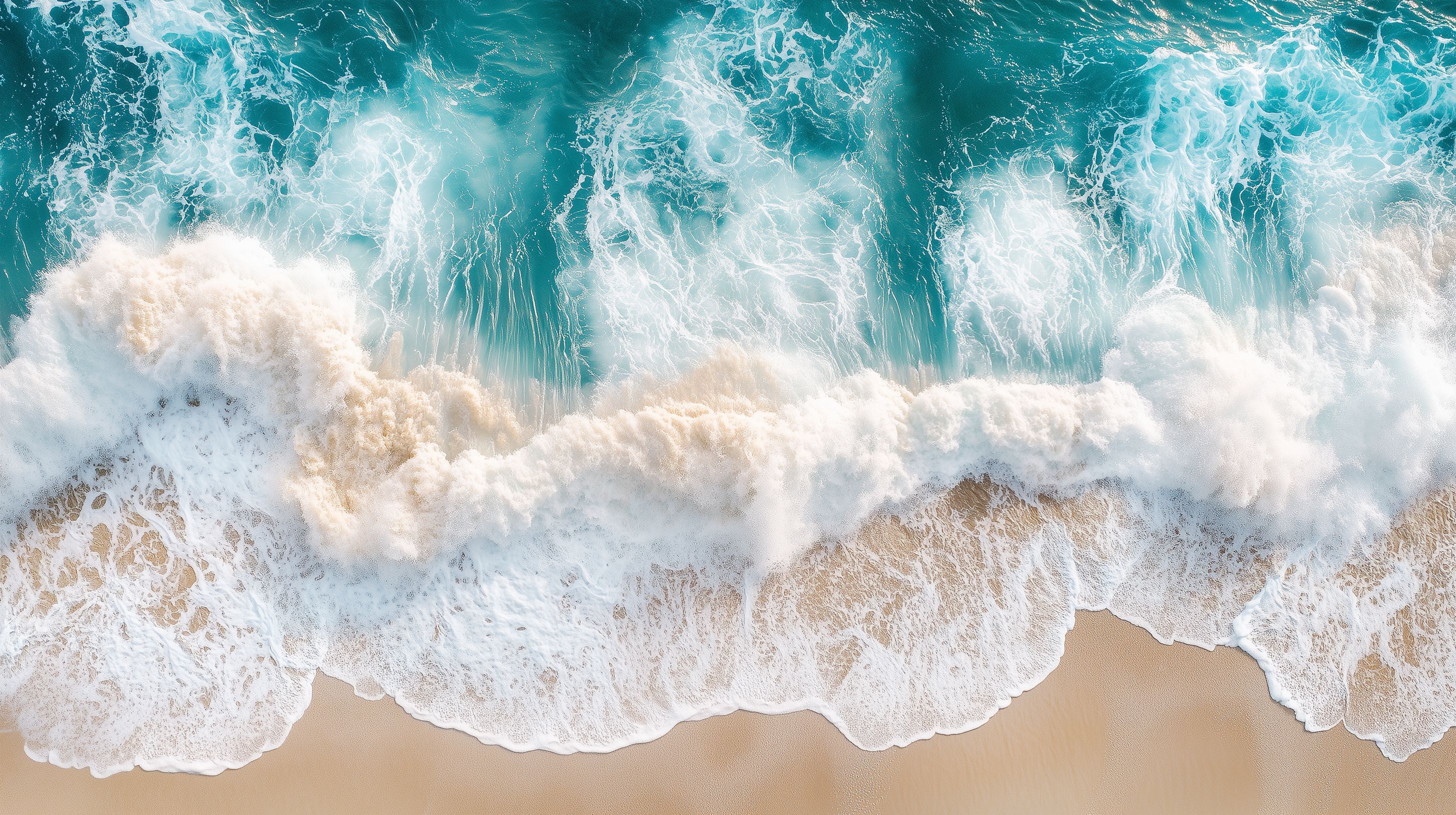 Luftaufnahme von großen Wellen, die auf einen Sandstrand treffen