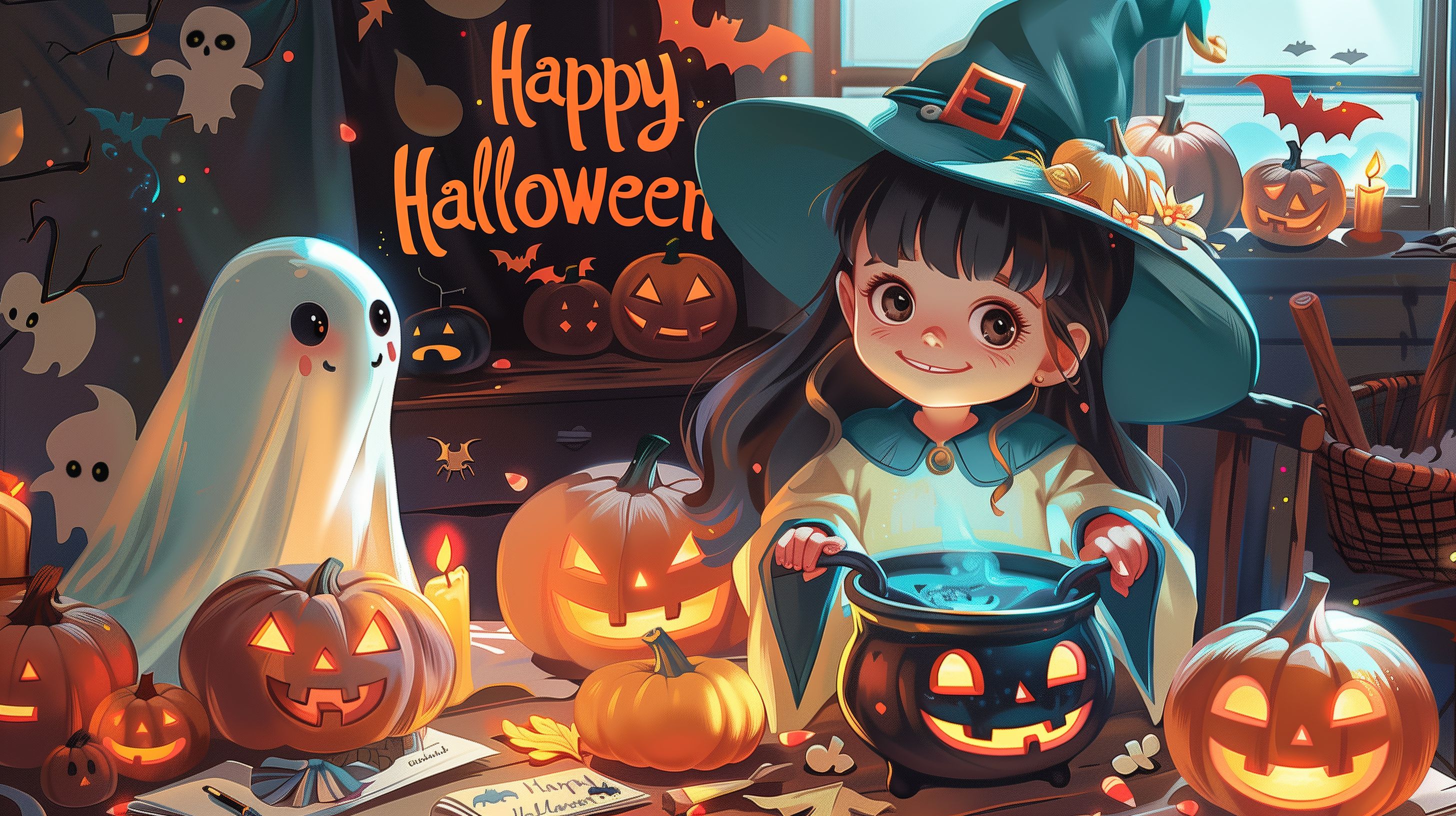 Mädchen im Hexenkostüm mit Kürbissen zu Halloween