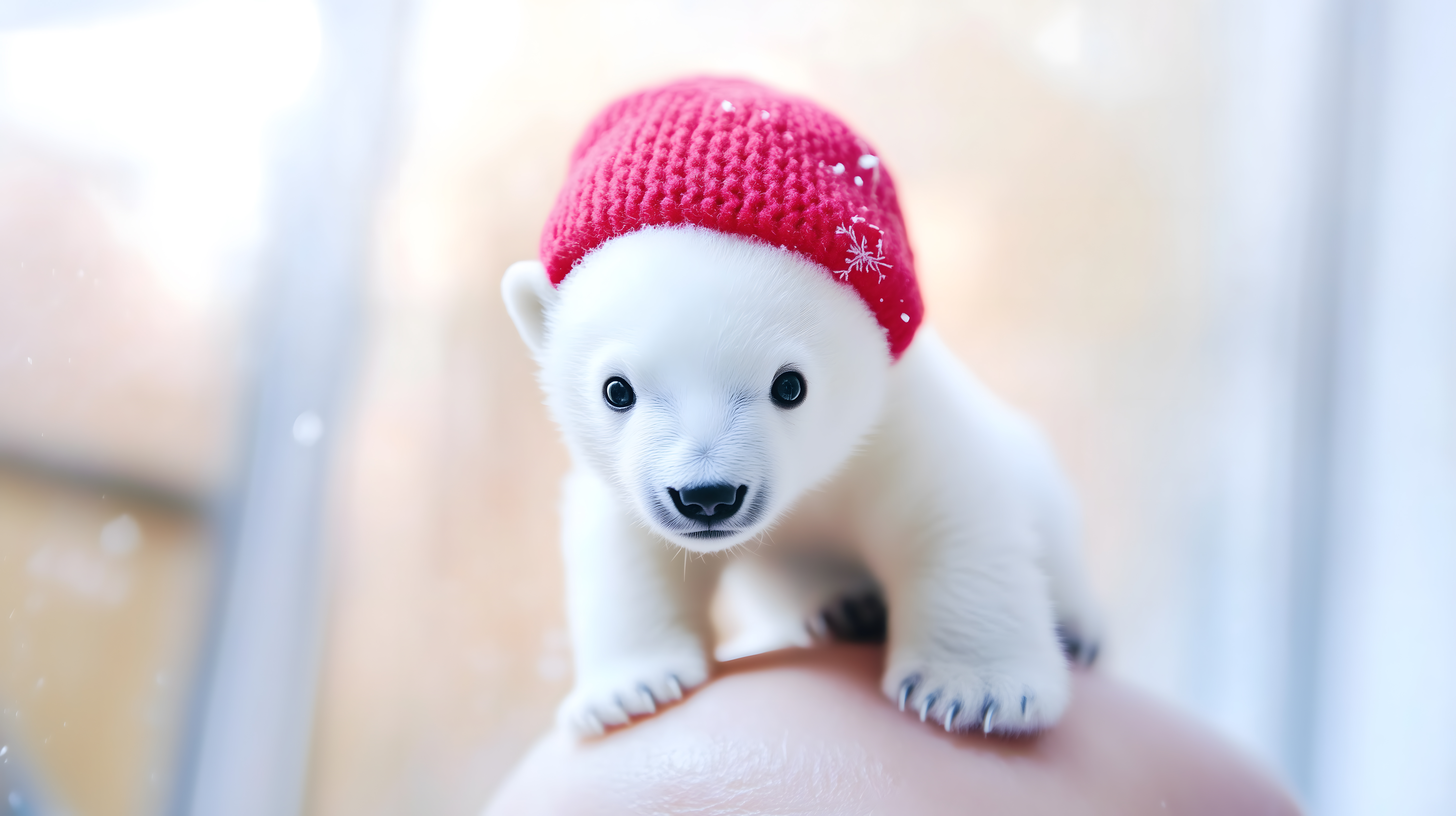 Makroaufnahme eines Polarbärenjungen mit roter Mütze