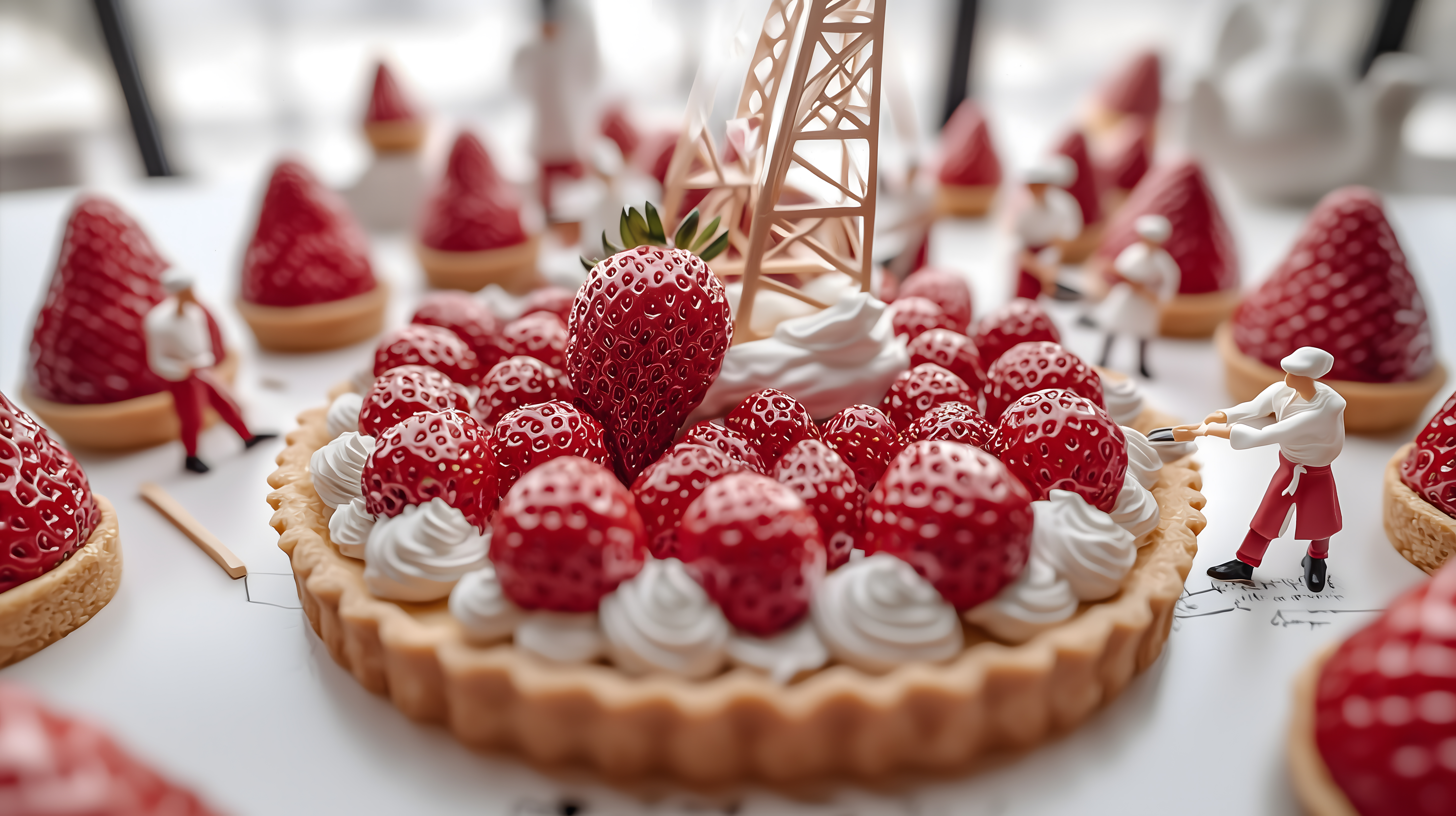 Mini-Konditoren verzieren Erdbeertorte mit Sahne