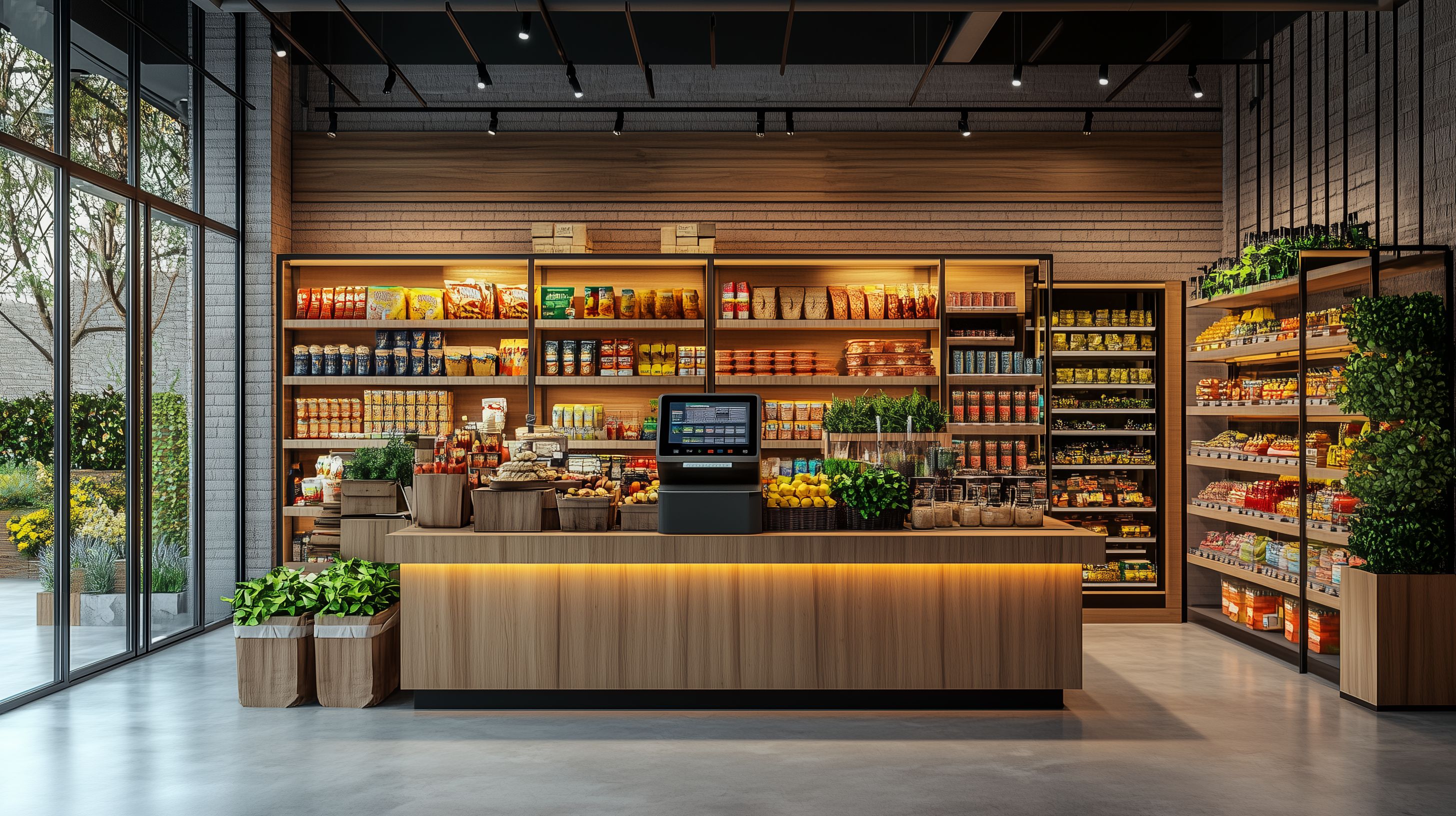 Moderne Supermarkteinrichtung mit Kassensystem und Regalen