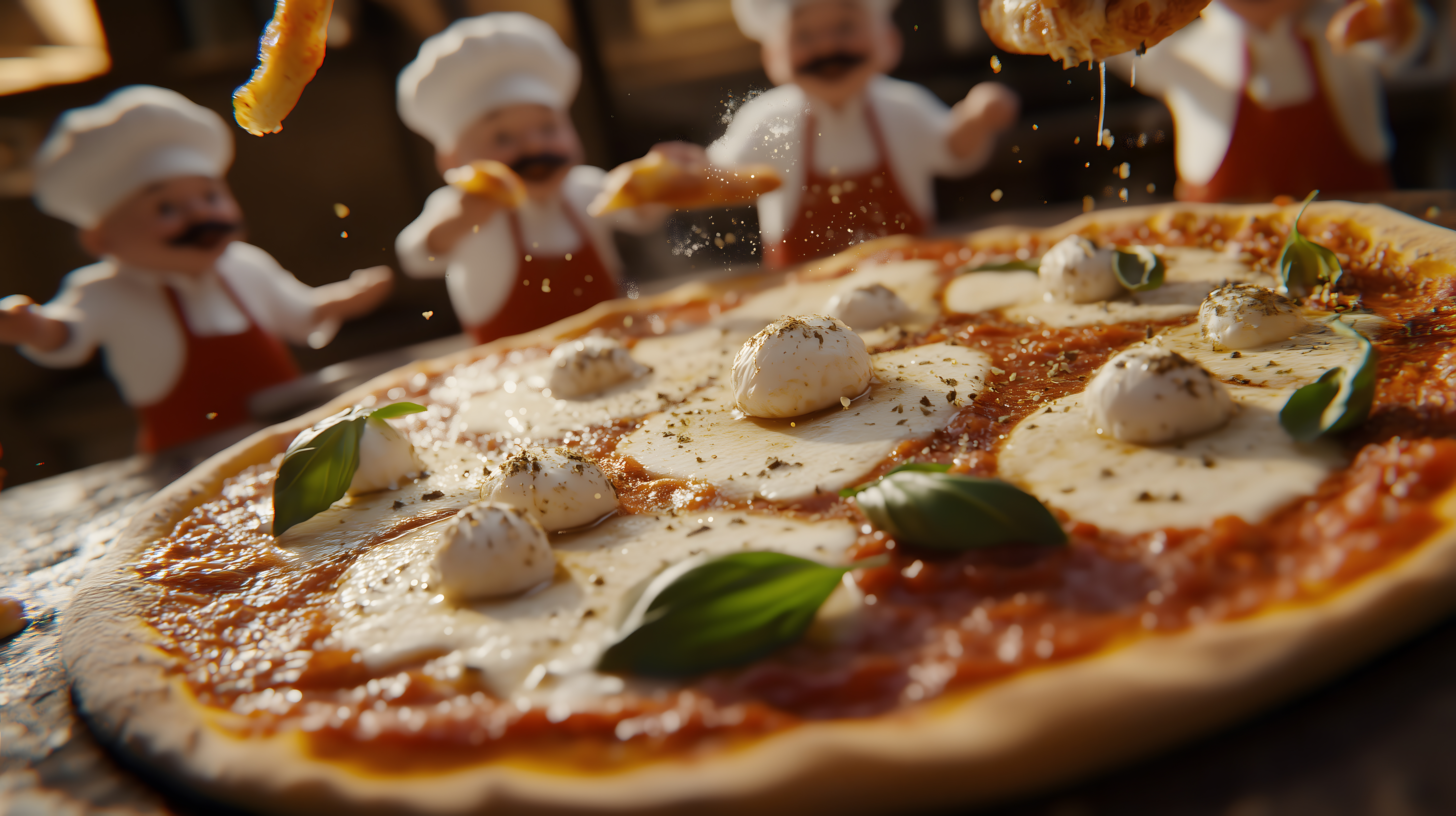 Mozzarella Pizza mit Mini-Köchen und frischem Basilikum