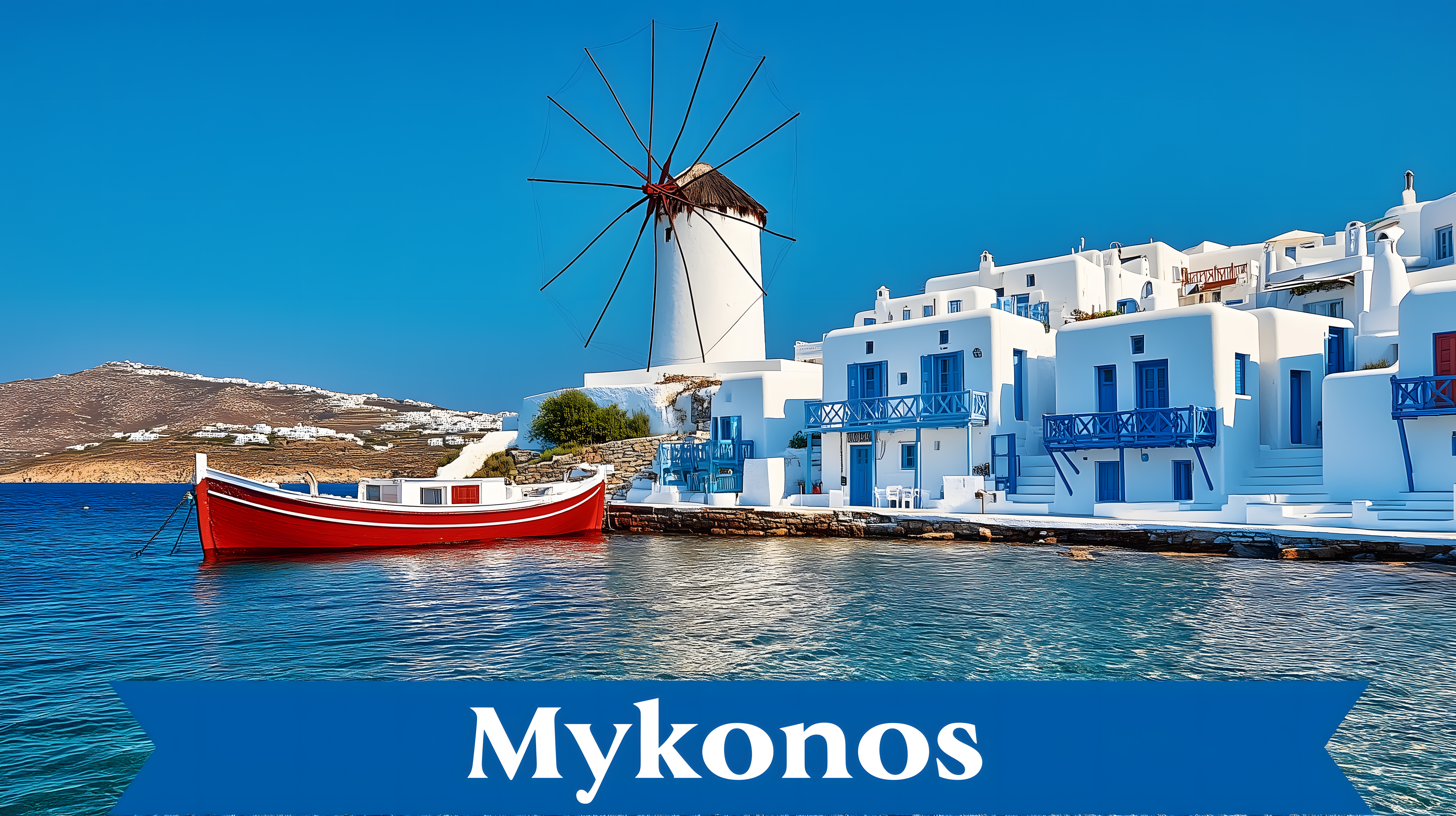 Mykonos mit weißen Häusern, blauen Balkonen und Windmühle, idyllische Kykladen-Insel