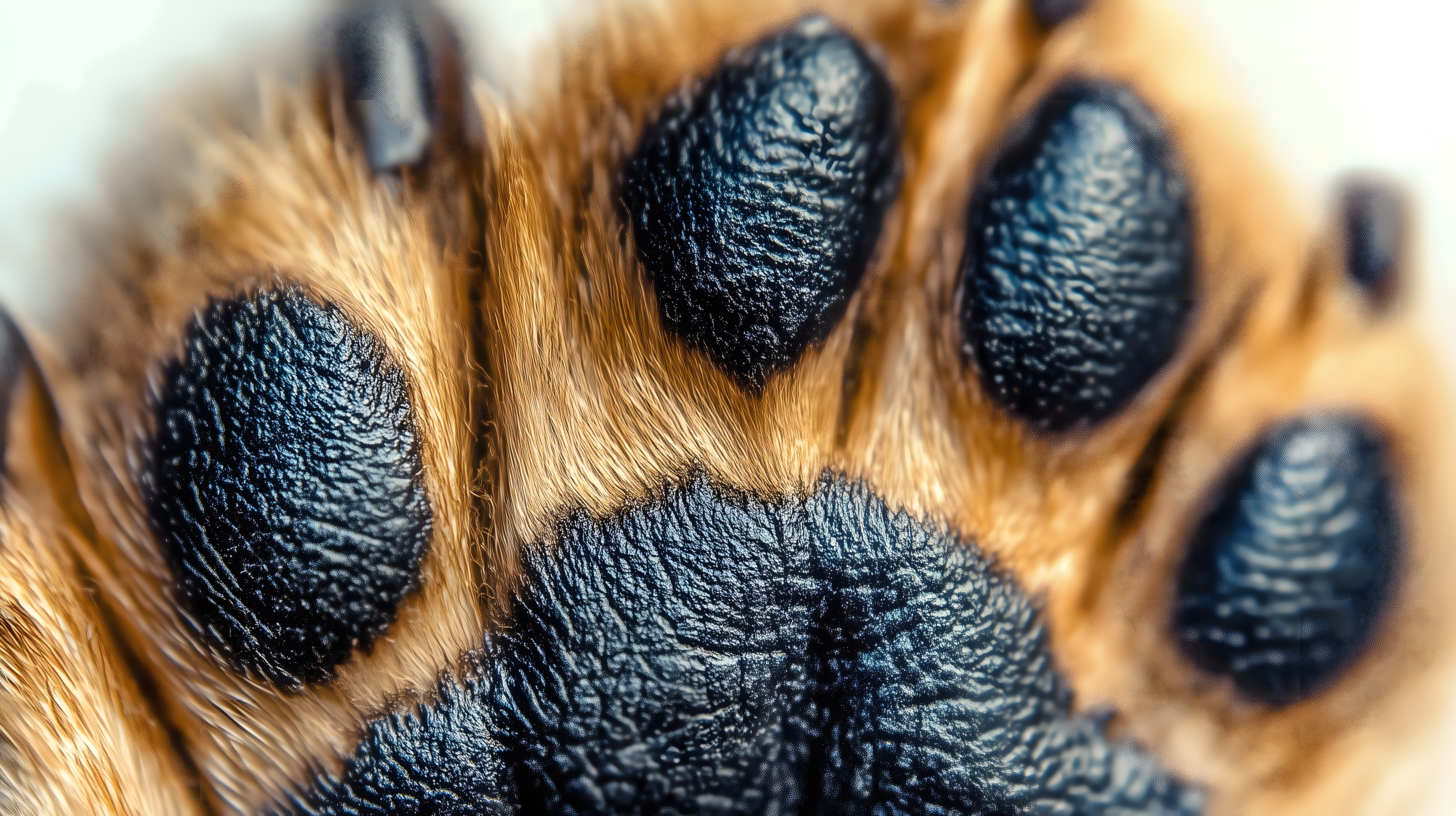 Nahaufnahme einer Hundepfote mit Fell und Ballen in Detailansicht