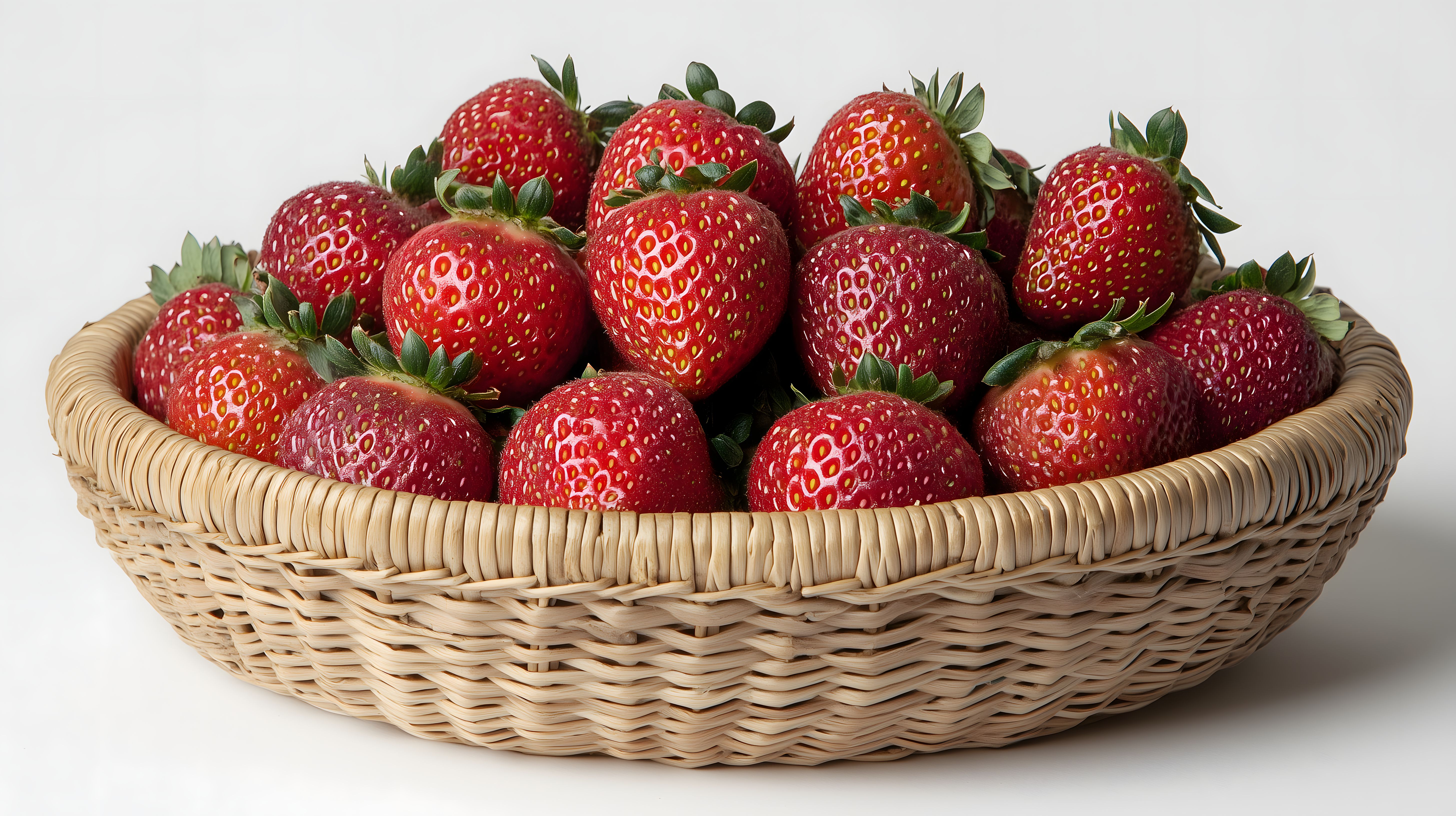 Nahaufnahme eines Korbs mit frischen roten Erdbeeren auf weißem Hintergrund