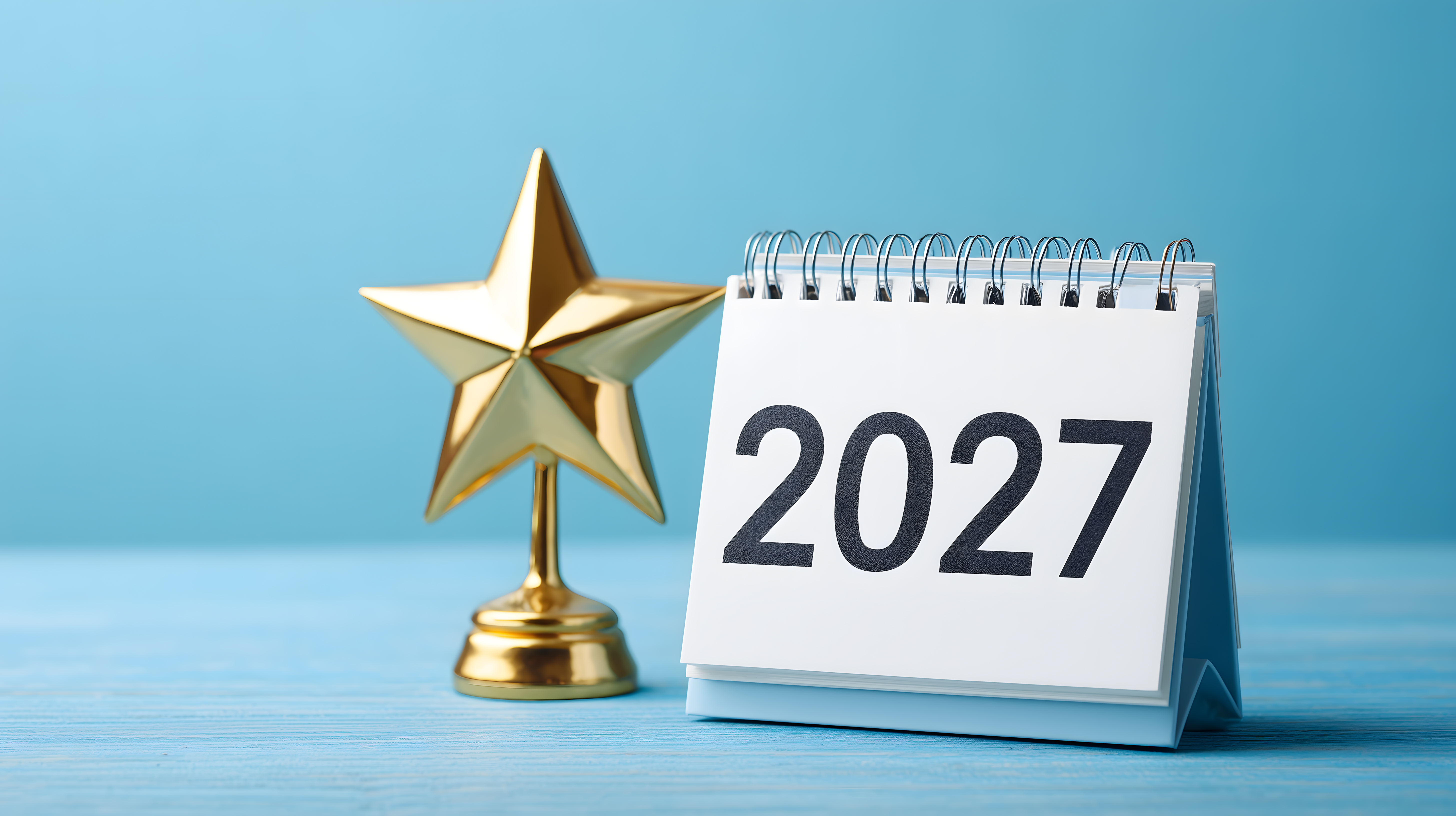 Neujahr 2027 Kalender mit goldenem Stern auf Tisch