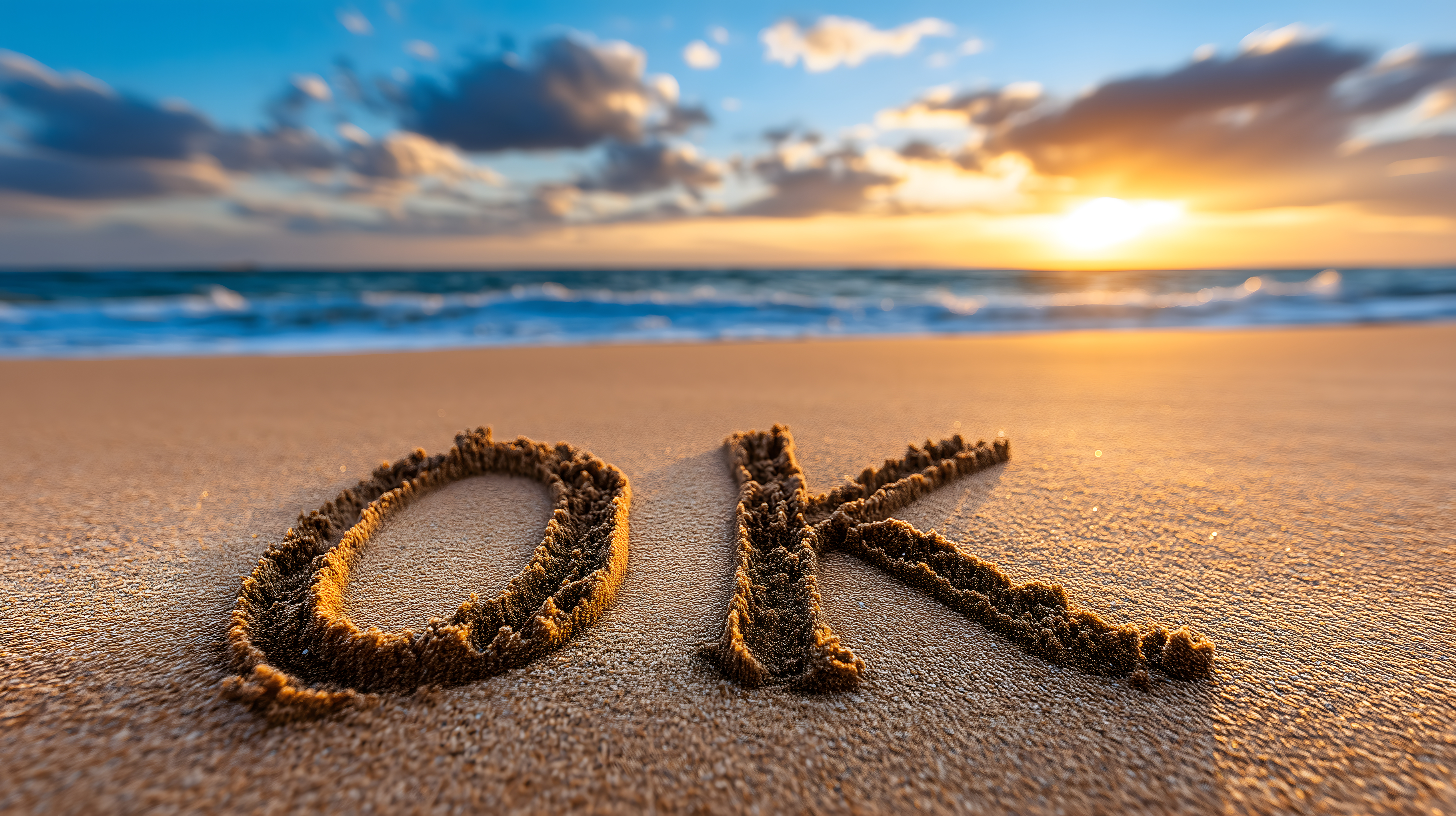 OK im Sand geschrieben bei Sonnenuntergang am Meer