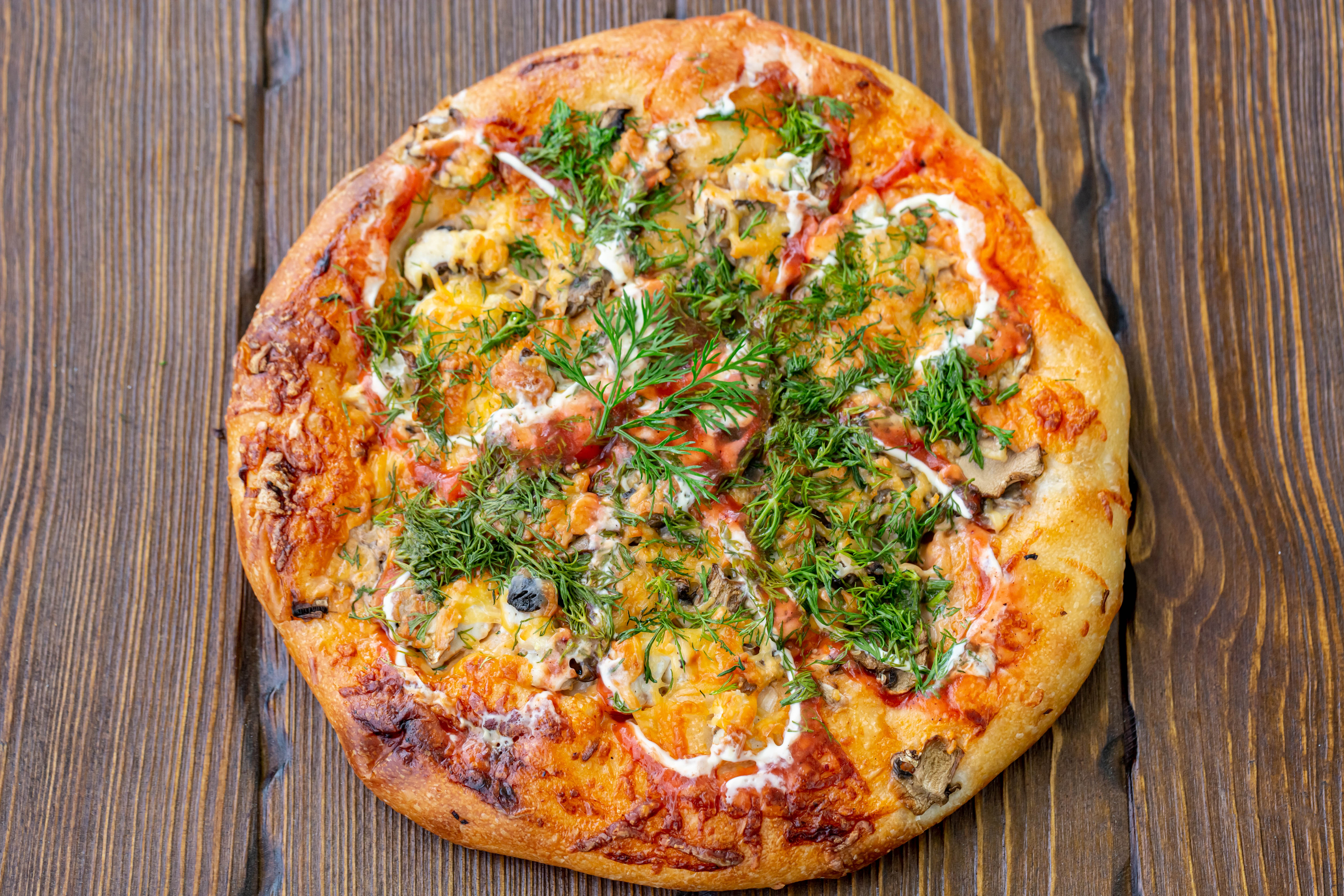 Pizza with mushrooms, sauce, chicken and dill on a wooden background