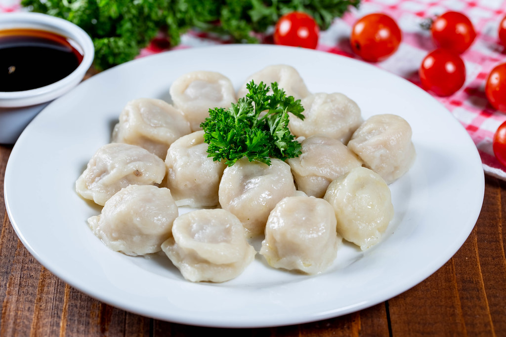 Plate of dumplings with sauce, herbs and cherry tomatoes