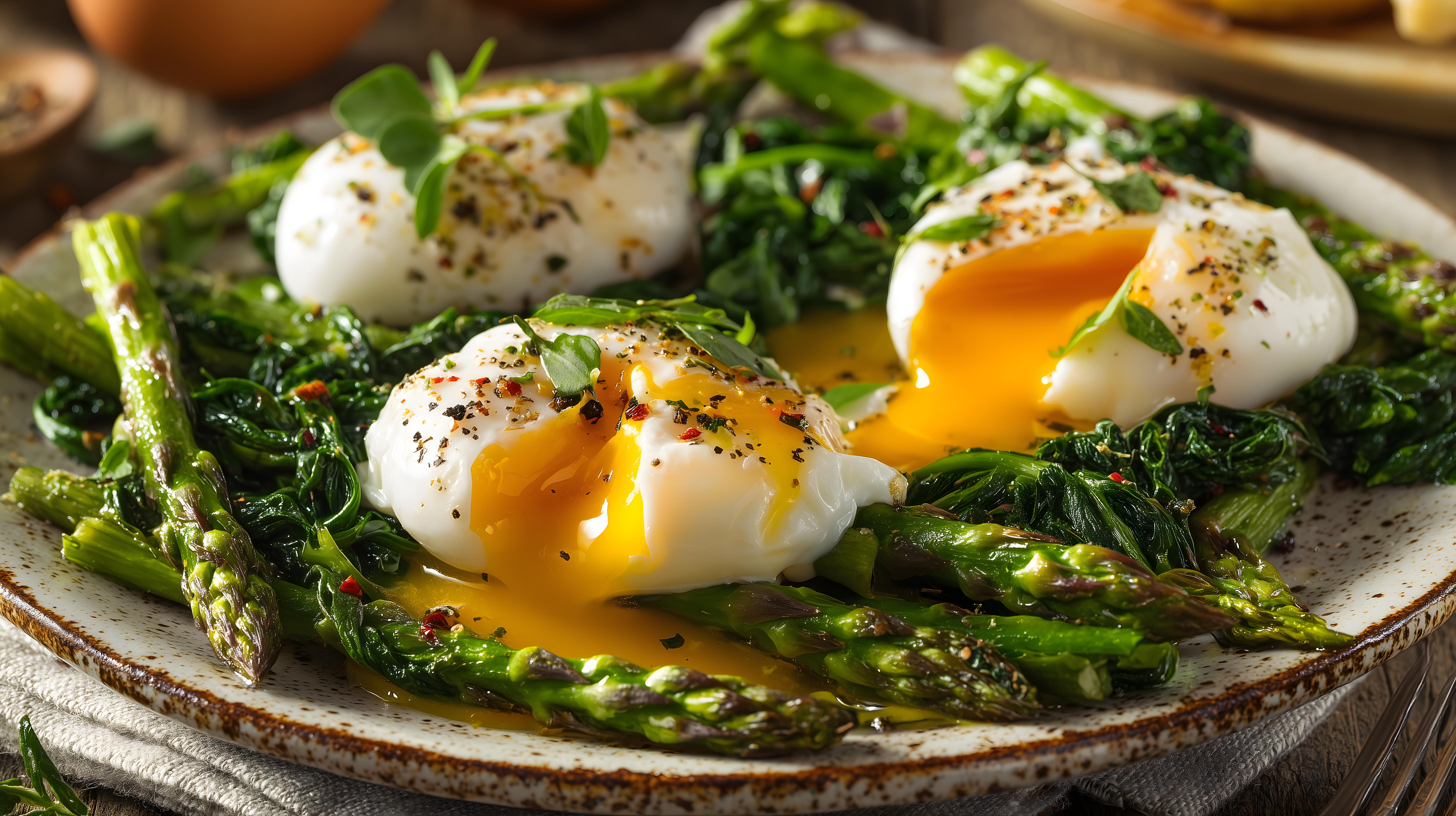 Pochierte Eier mit grünem Spargel und Spinat auf Teller