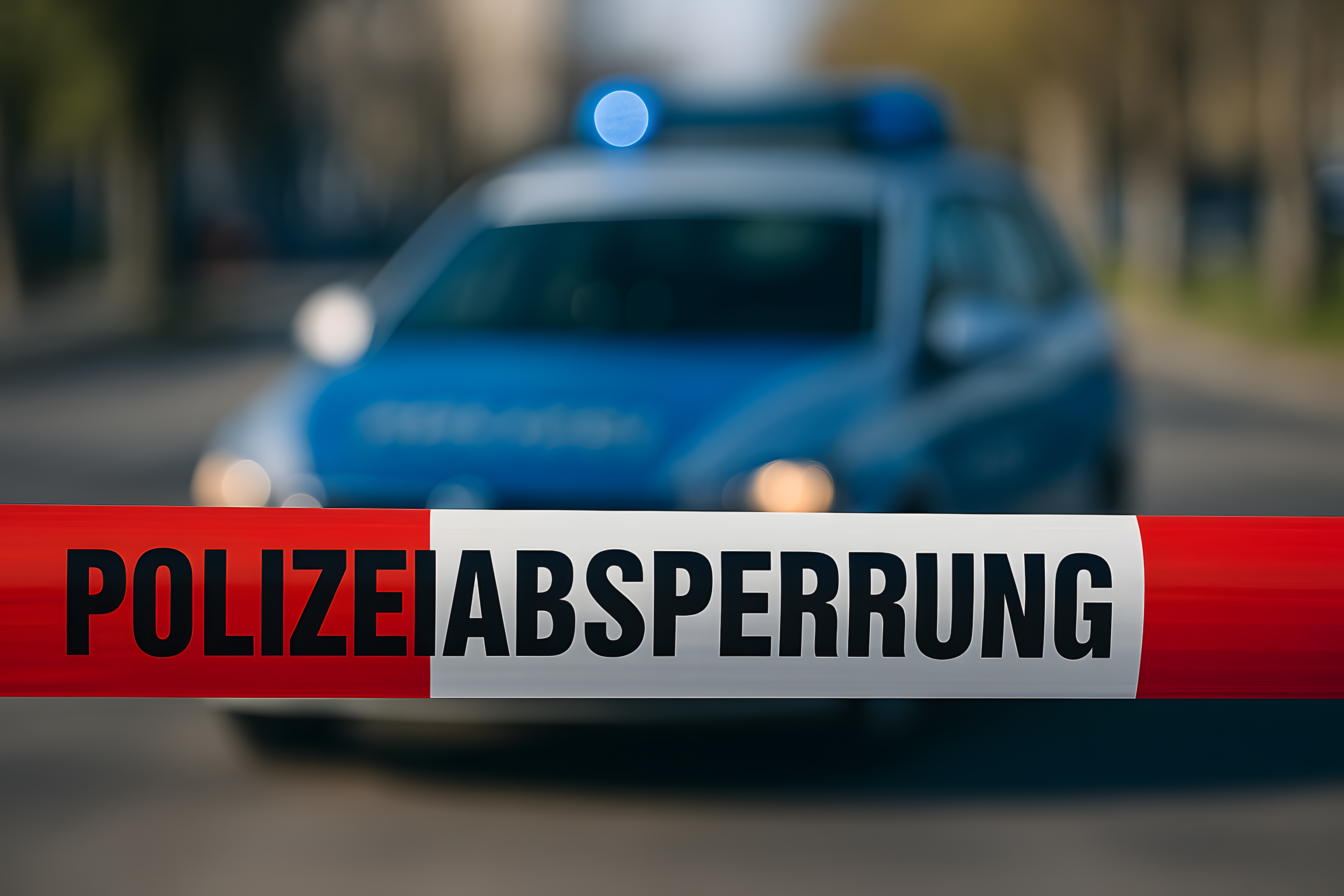 Polizeiabsperrung vor Polizeiauto mit Blaulicht auf Straße