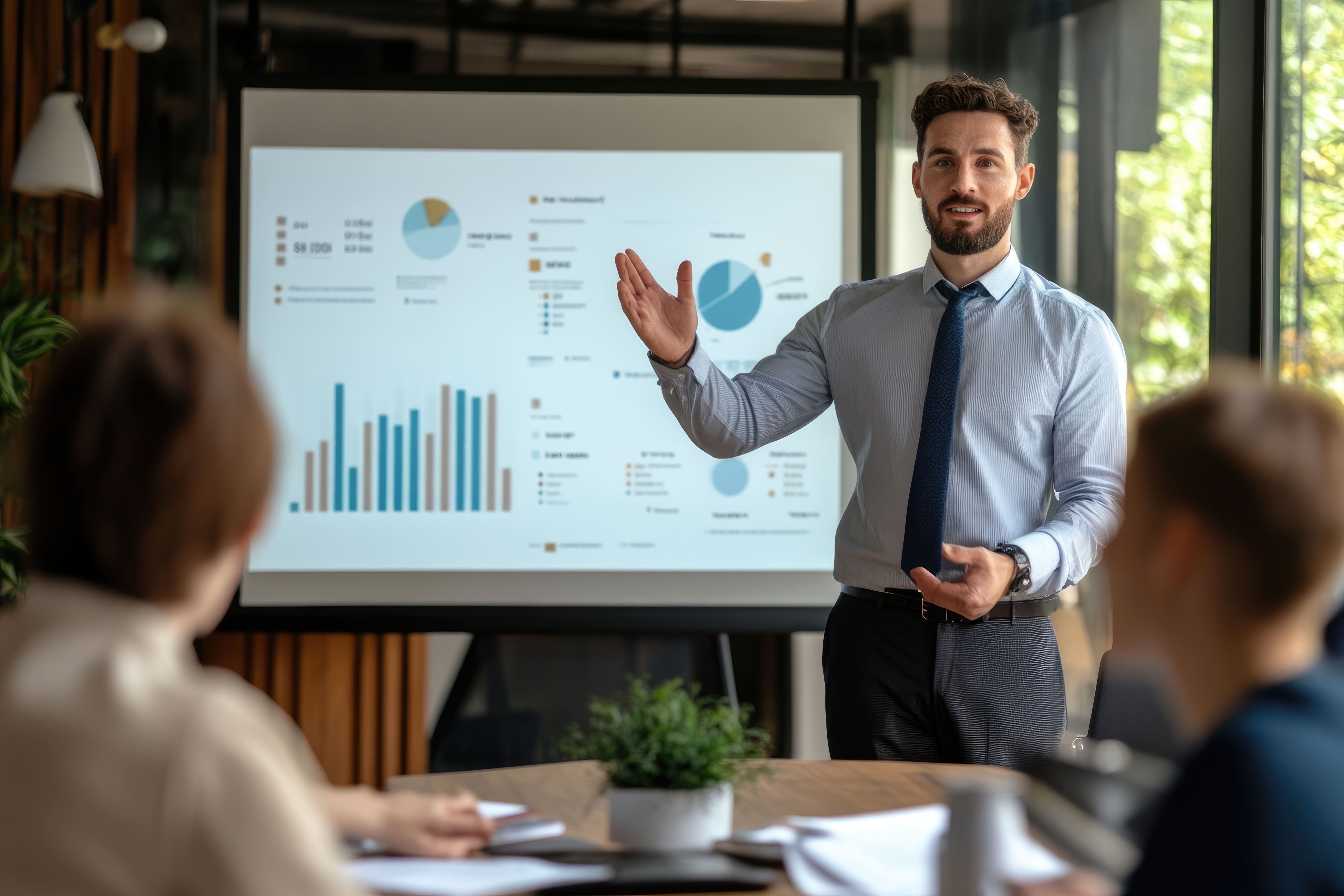 Präsentation an einer Leinwand durch einen Geschäftsmann