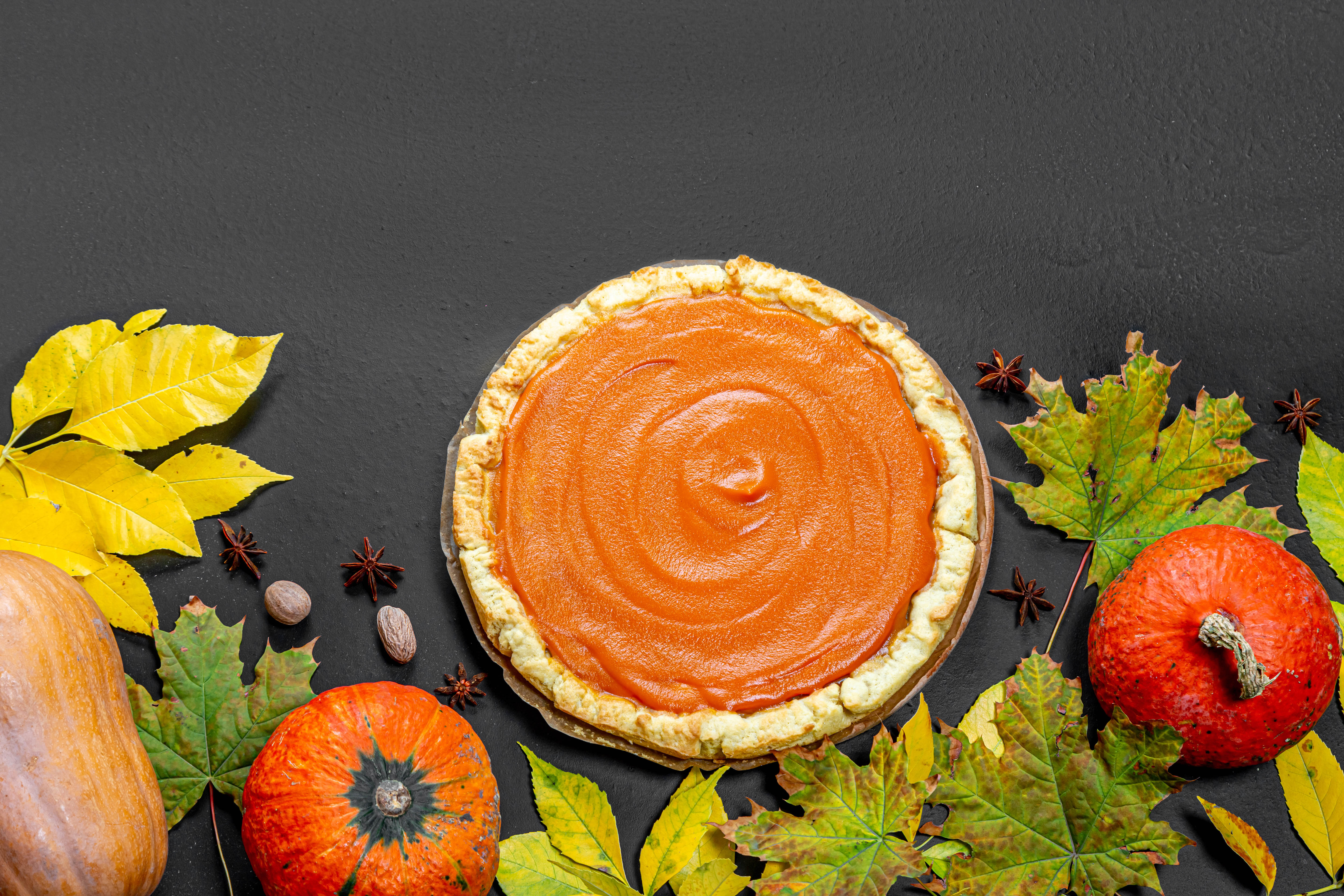 Pumpkins with yellow leaves and pumpkin pie. Background for thanksgiving day