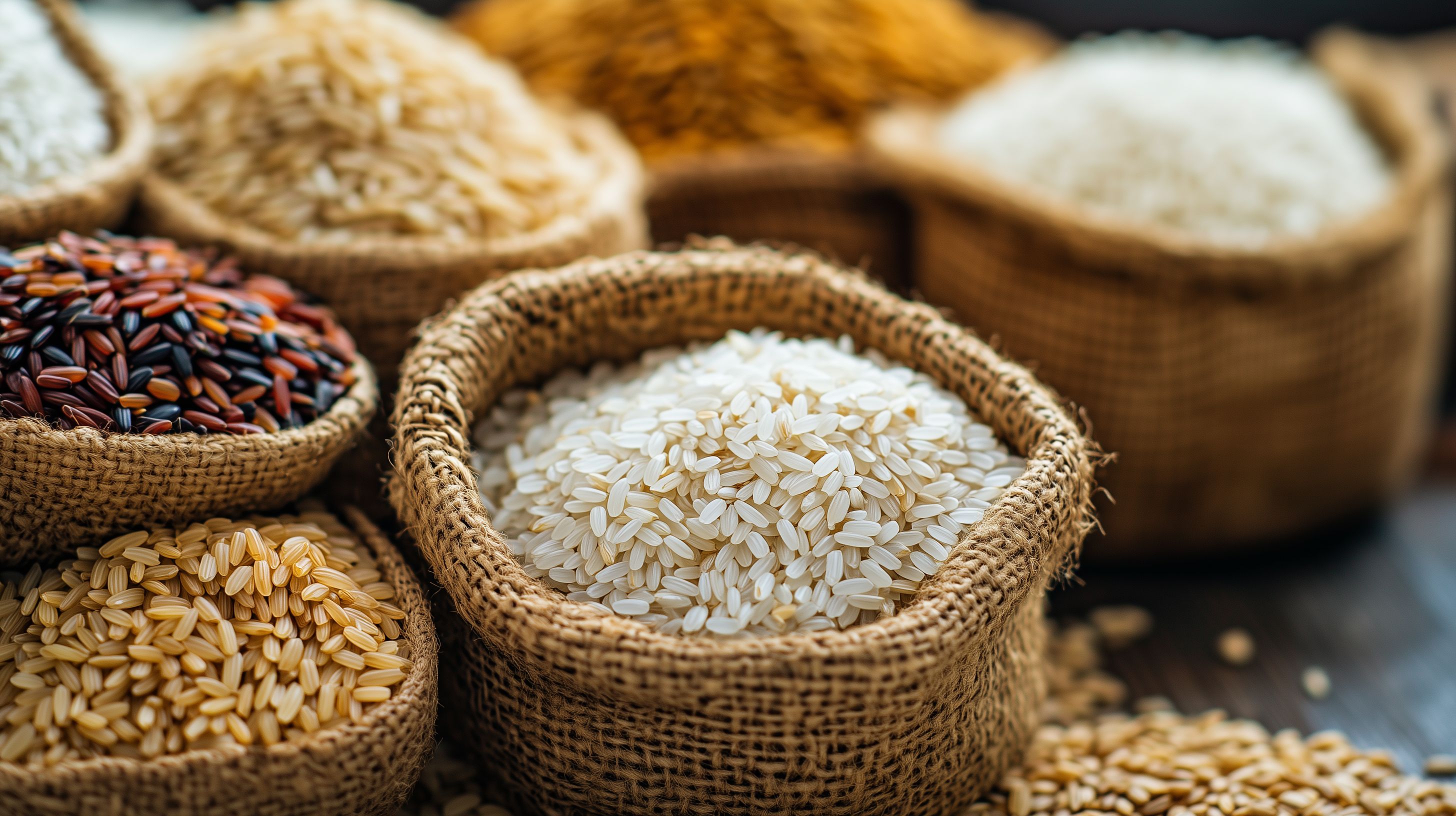 Reissäcke gefüllt mit verschiedenen Reissorten