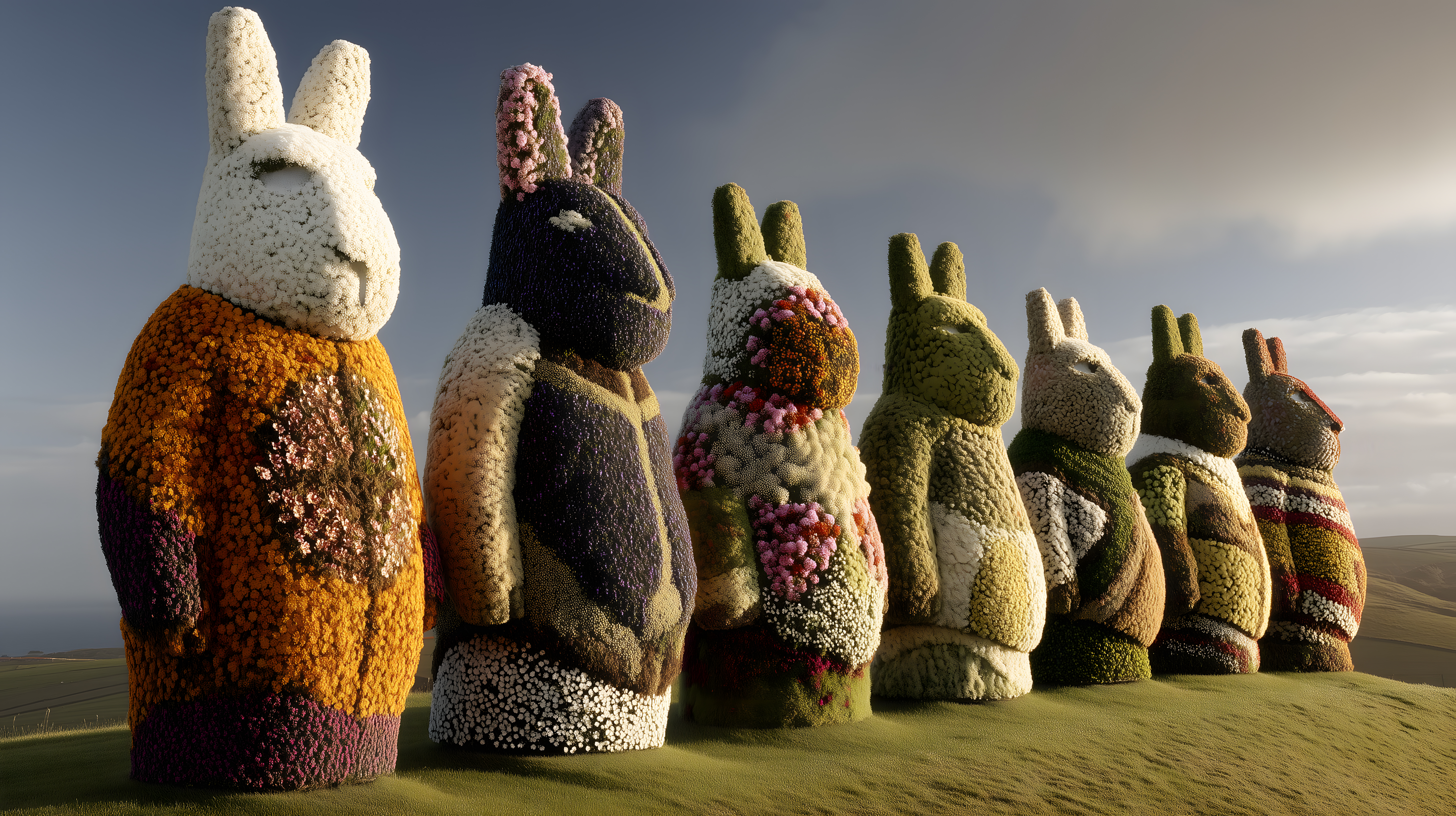 Riesige Osterhasen aus Frühlingsblumen als kreative Skulpturen der Osterinseln
