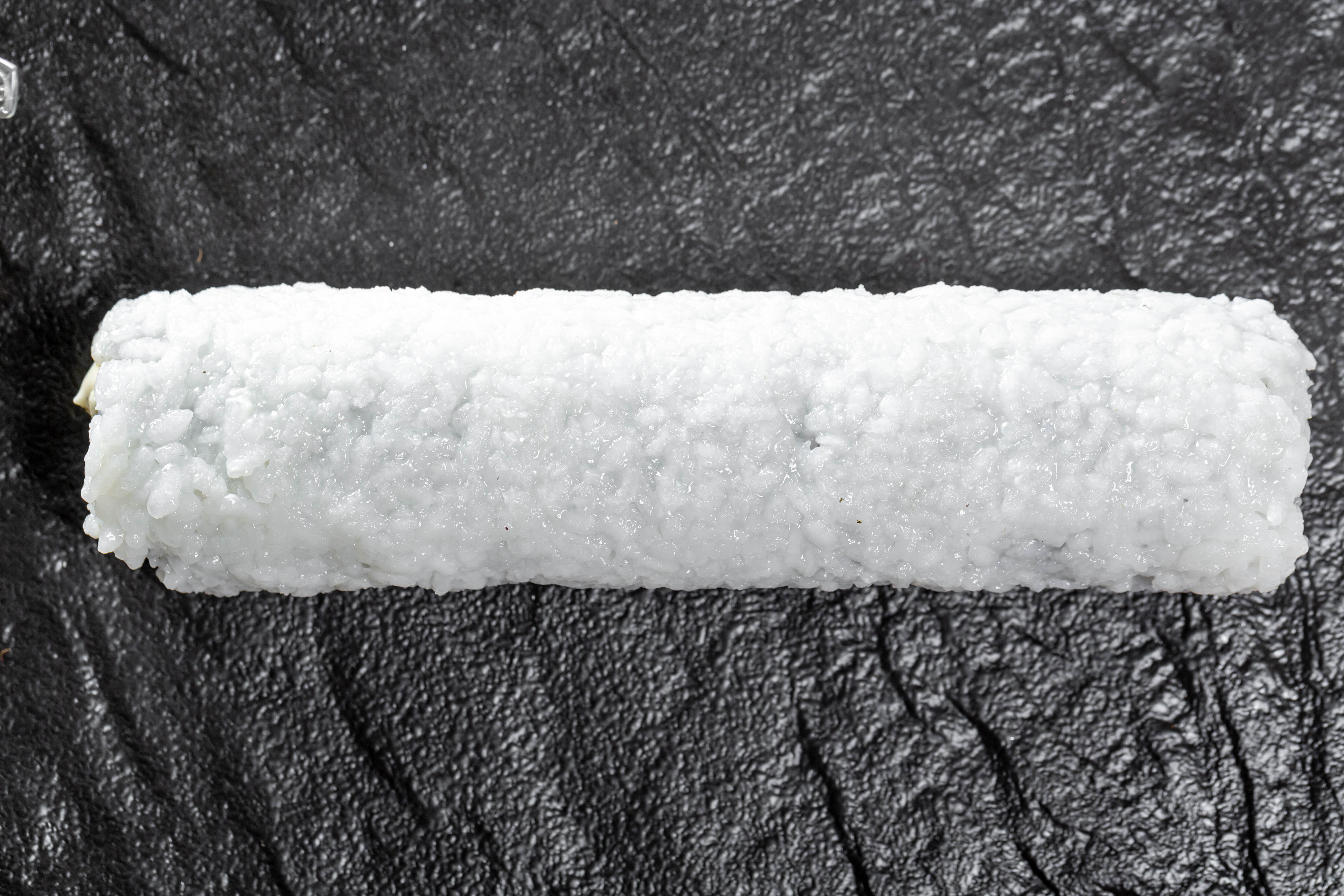 Roll with rice, cucumber and Philadelphia cheese on a black stone tray. Top view