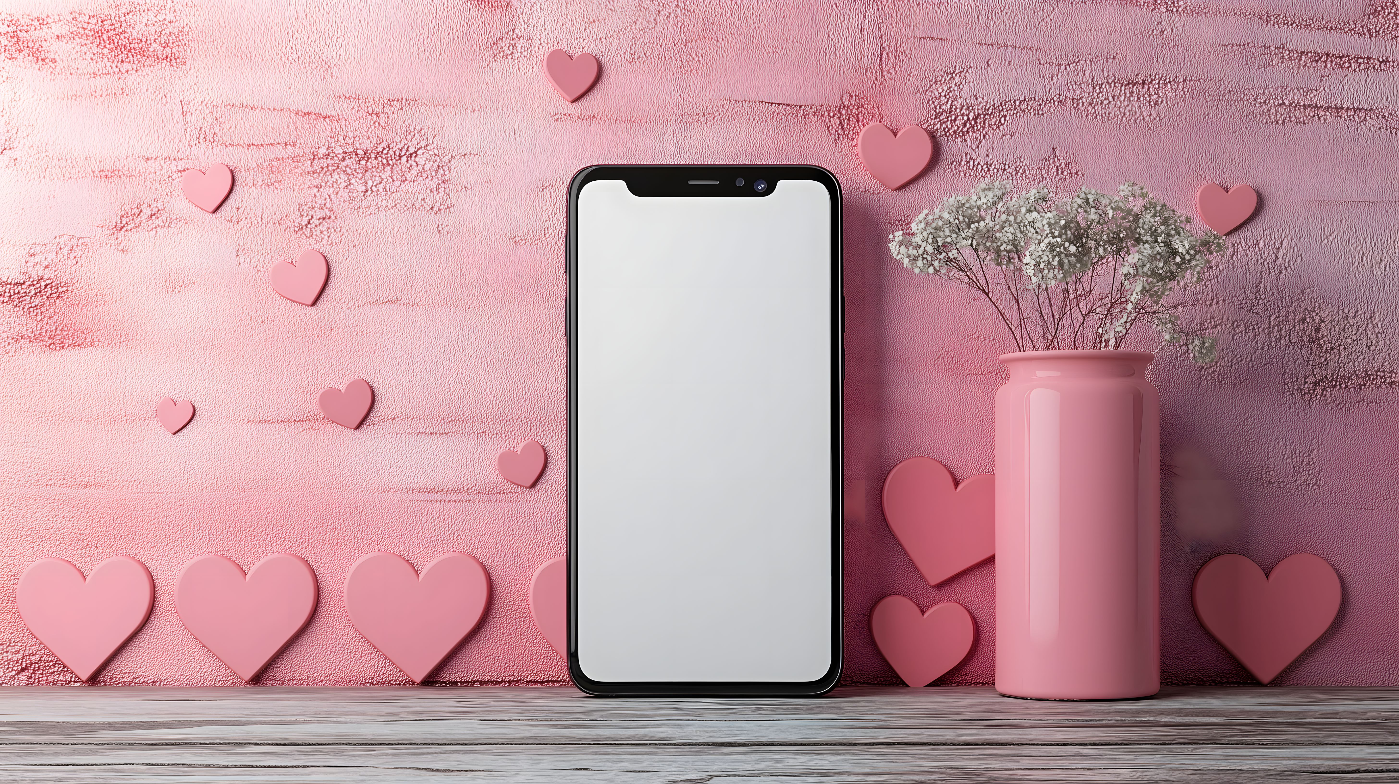 Romantische Handy-Mockup-Darstellung mit Herzen und Vase vor rosa Hintergrund
