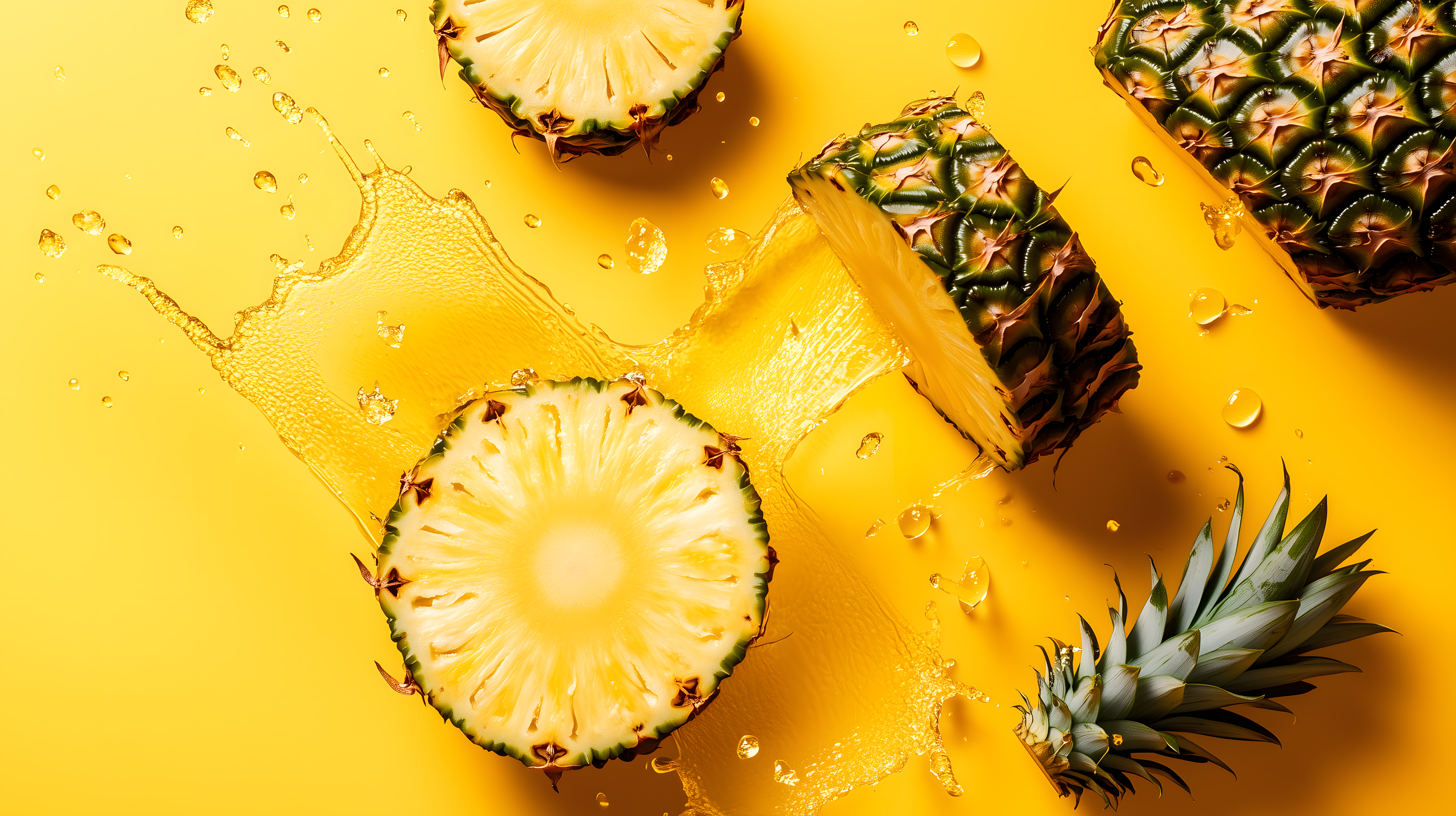 Saftige Ananasstücke mit spritzendem Ananassaft auf gelbem Hintergrund