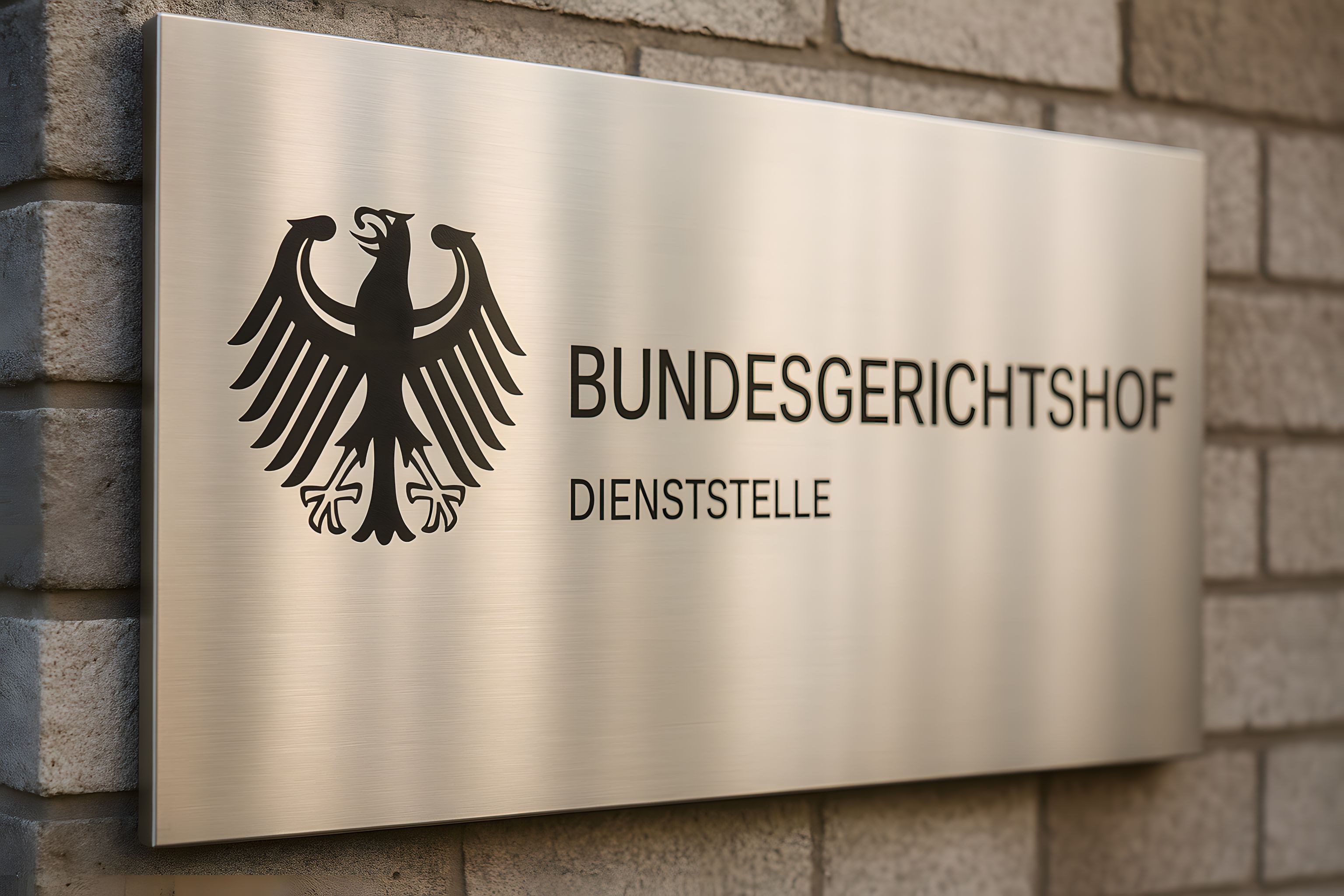 Schild des Bundesgerichtshofs mit Bundesadler auf Metallplatte