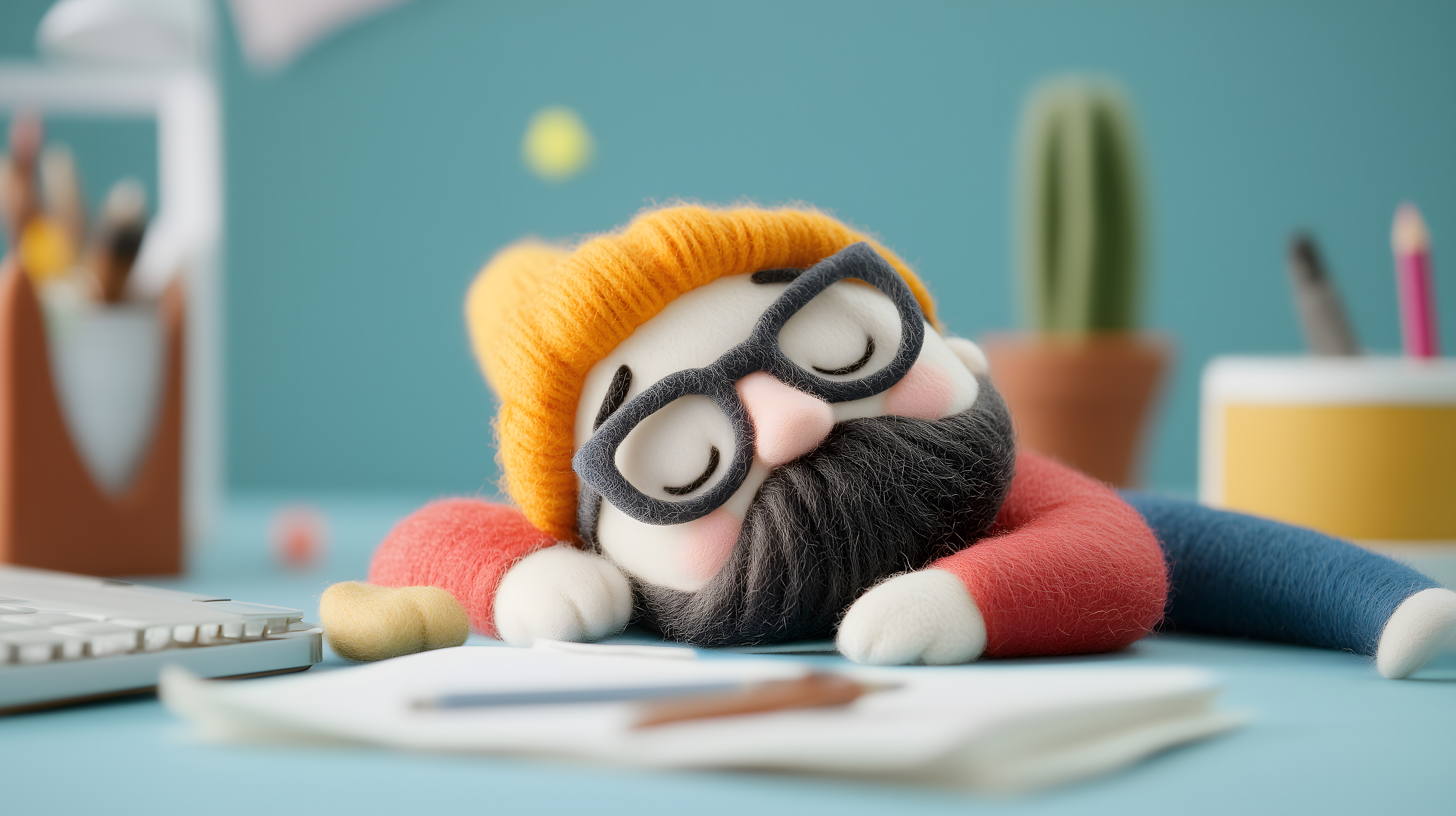 Schlafender Mann aus Filz am Schreibtisch mit Mütze und Bart