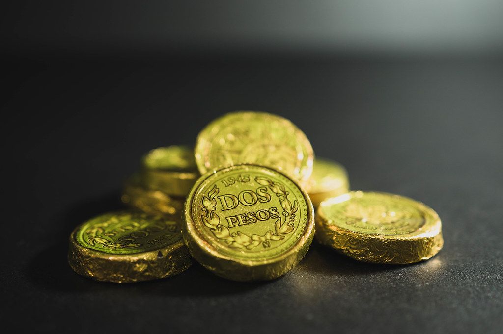 Schokoladenmünzen in goldener Verpackung mit dem spanischen Aufdruck "Dos Pesos", auf schwarzem Untergrund