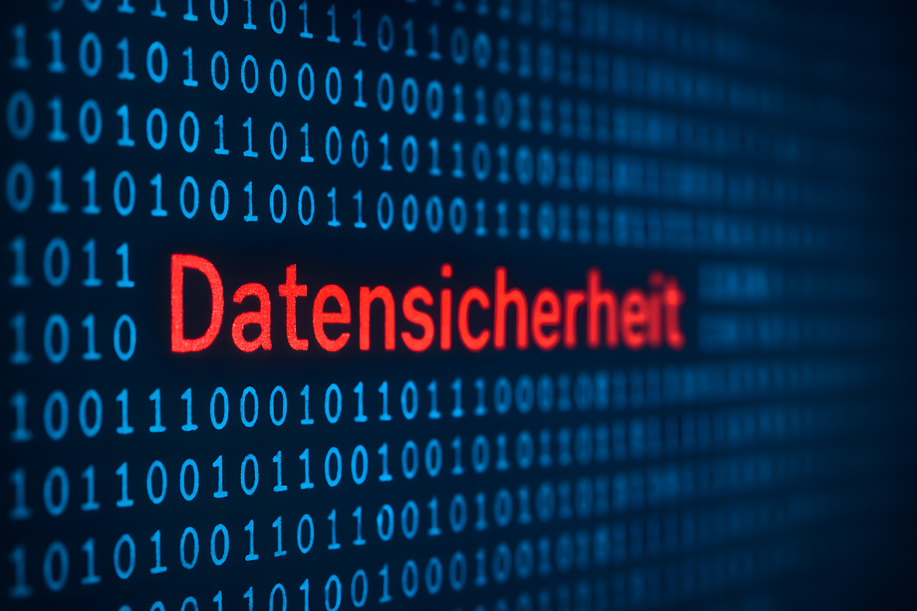 Schriftzug Datensicherheit in Rot vor digitalem Binärhintergrund