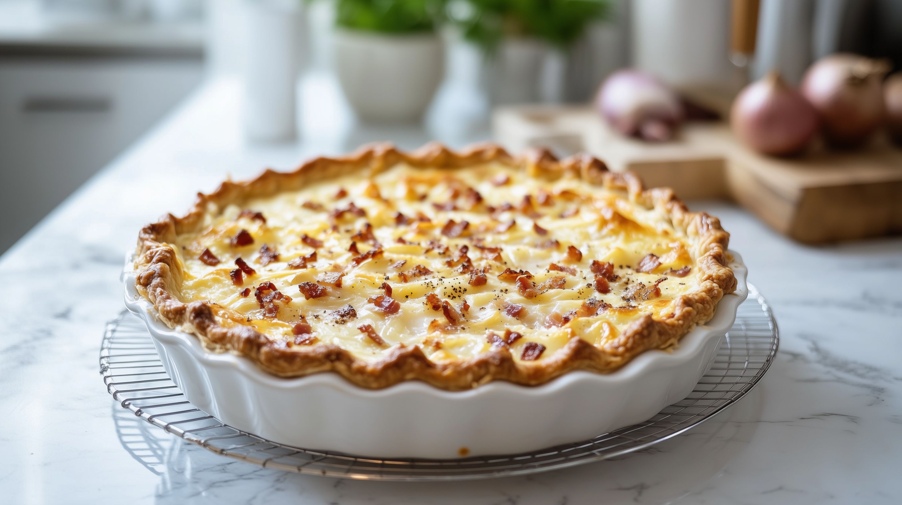 Schwäbischer Zwiebelkuchen frisch aus dem Ofen in weißer Backform