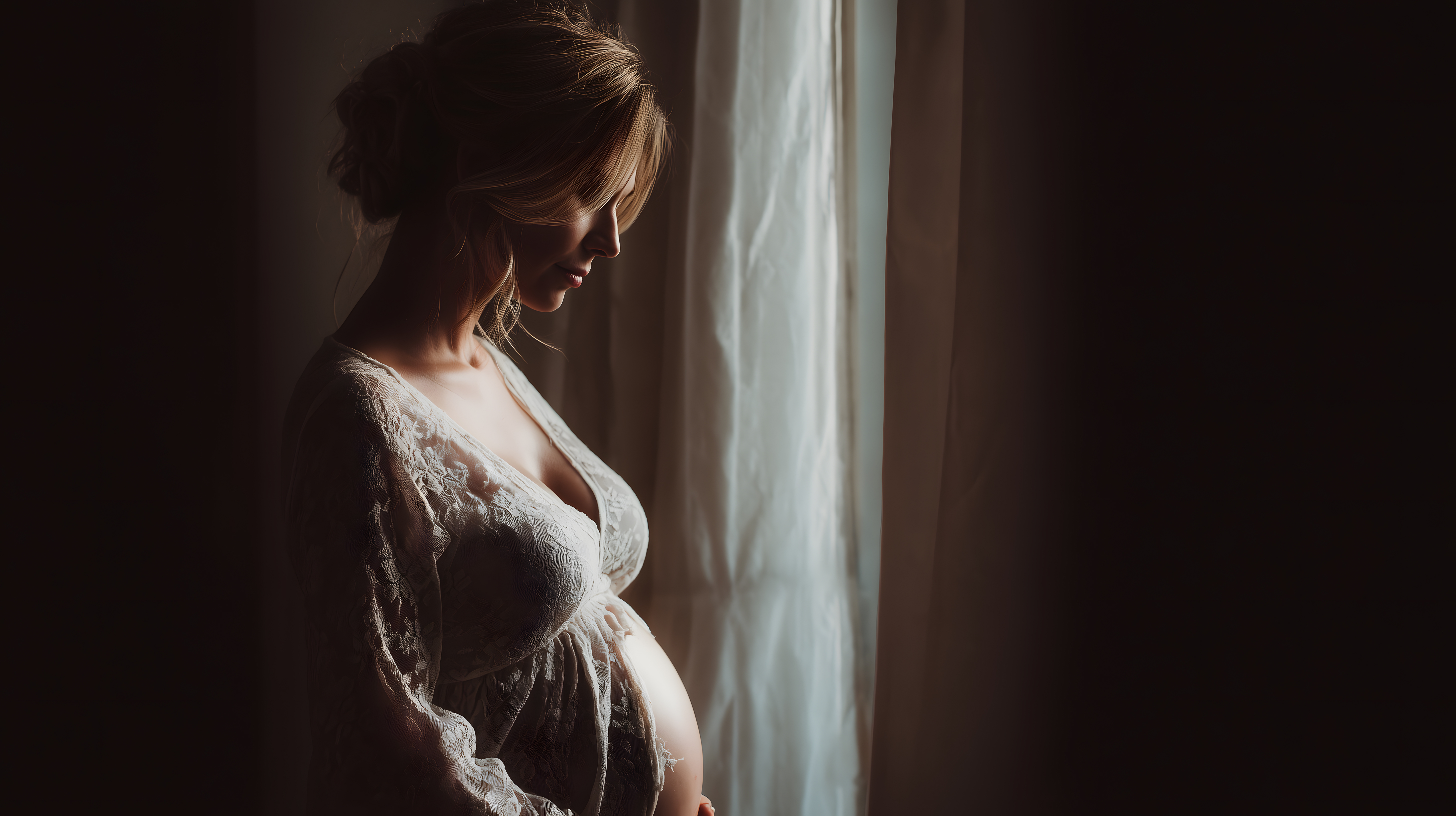 Schwangere Frau im Profil am Fenster im warmen Licht