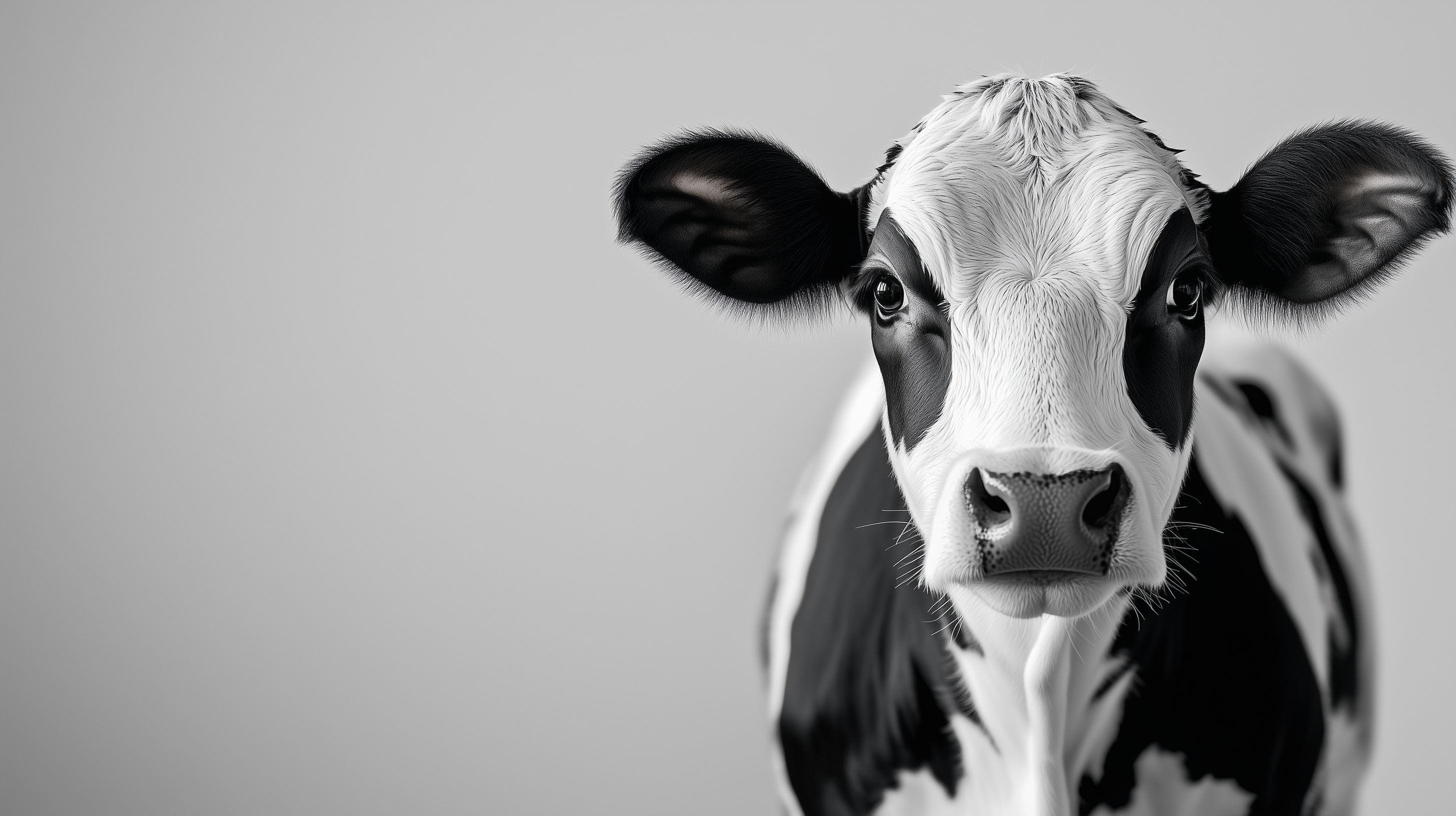 Schwarz-weiße Kuh mit neugierigem Blick auf weißem Hintergrund