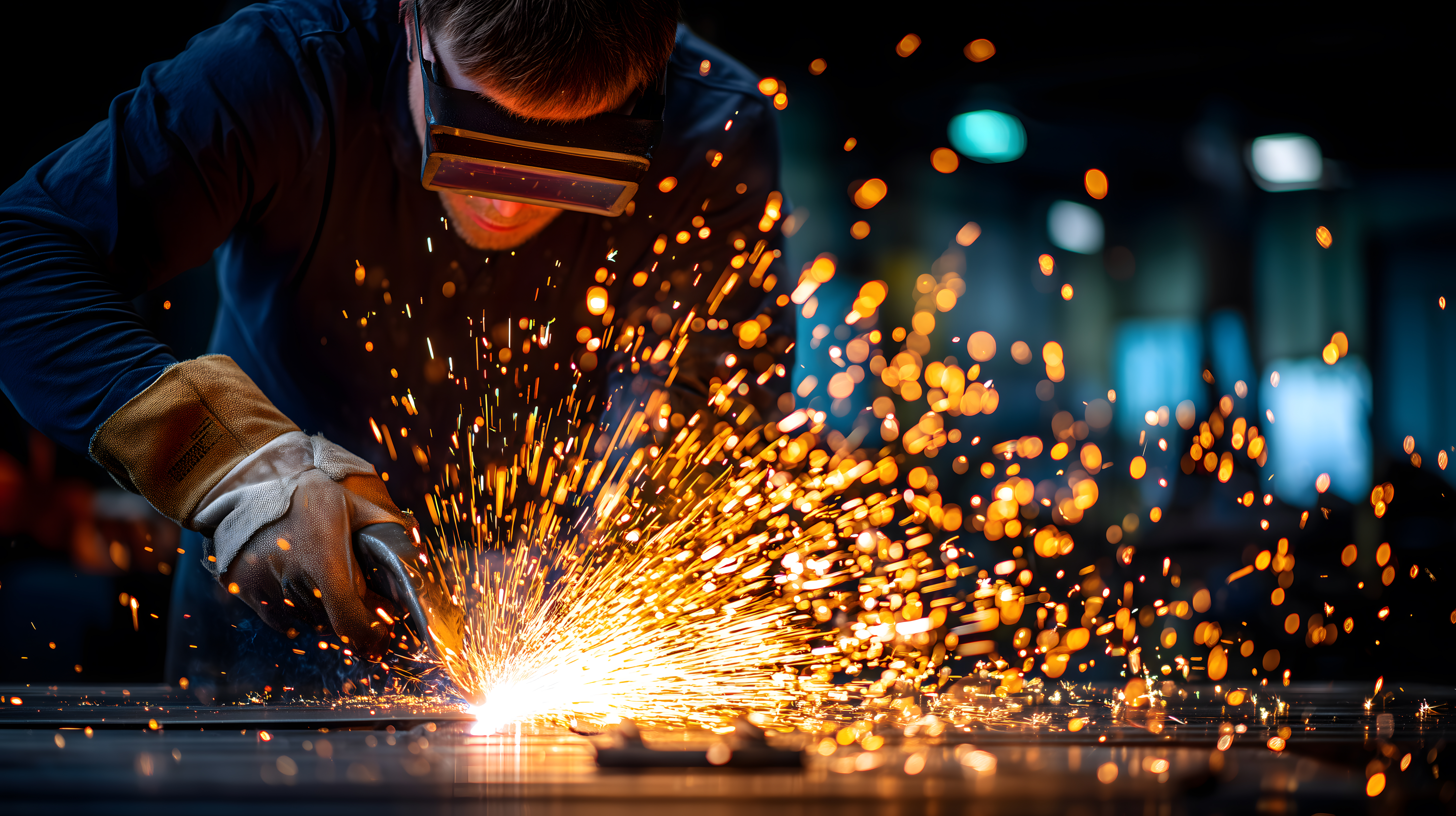 Schweißer mit Funkenflug in dunkler Werkstatt