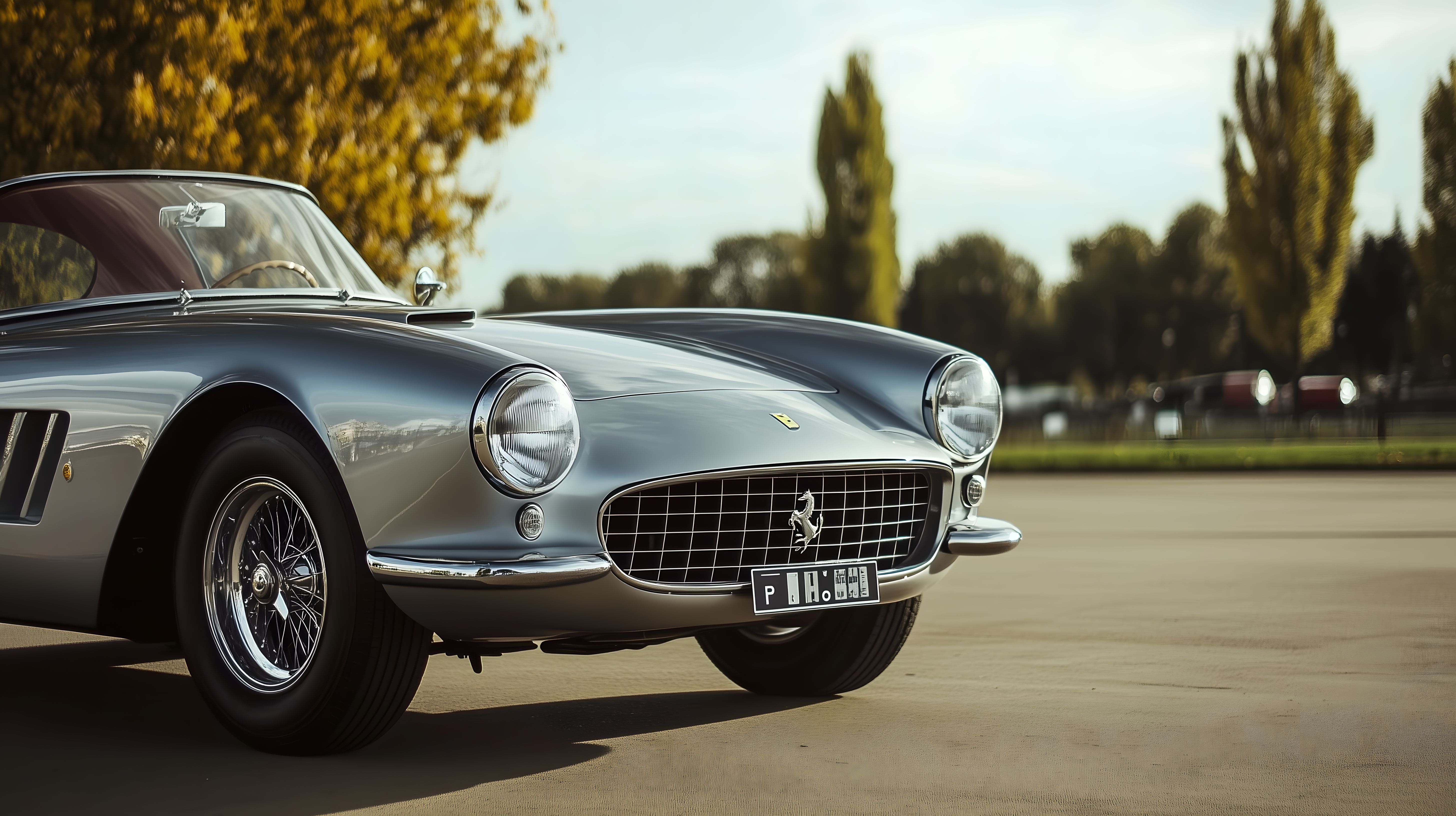 Silberner Ferrari Oldtimer vor herbstlicher Kulisse