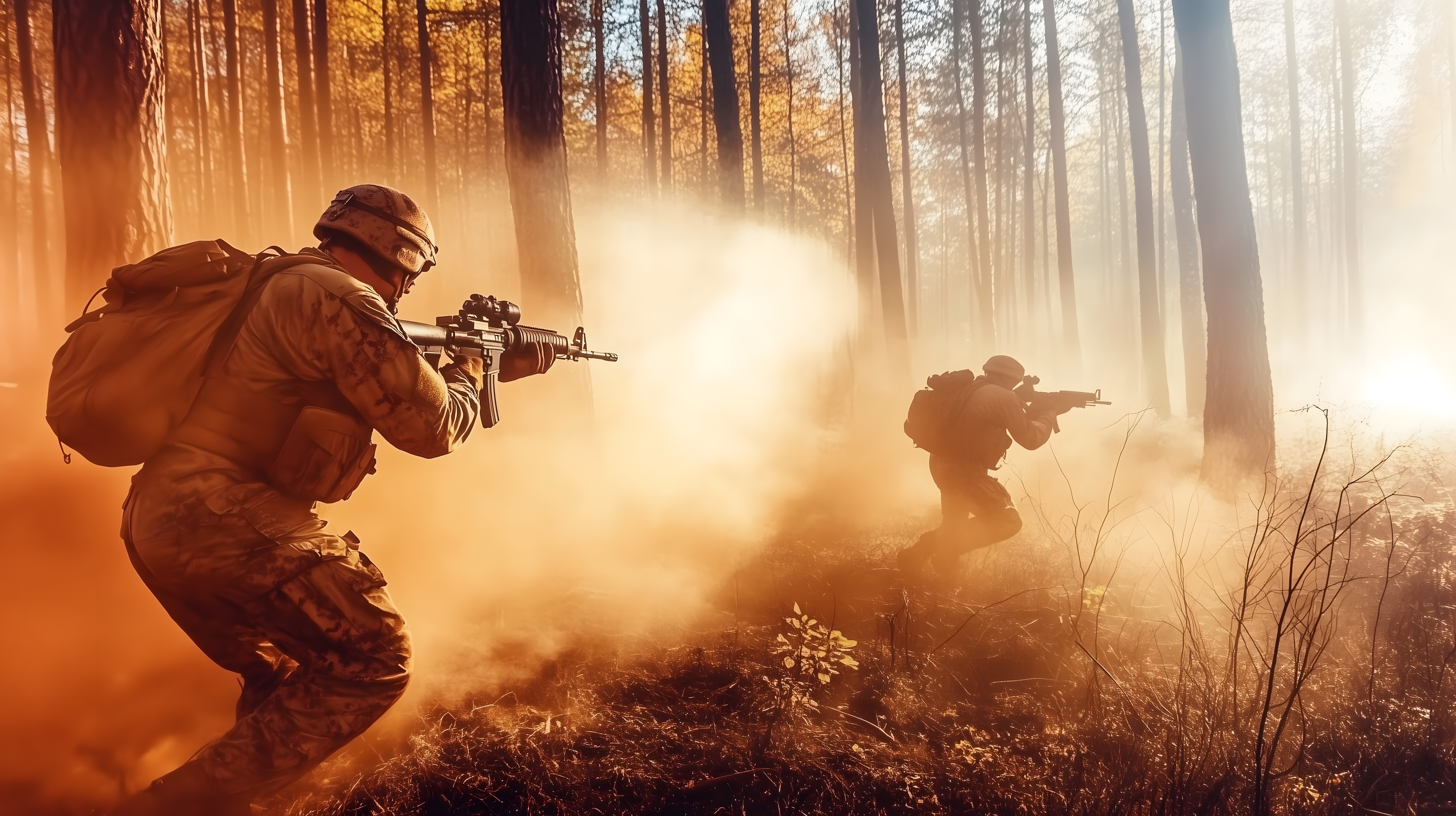 Soldaten mit Maschinengewehren im Wald beim Gefecht