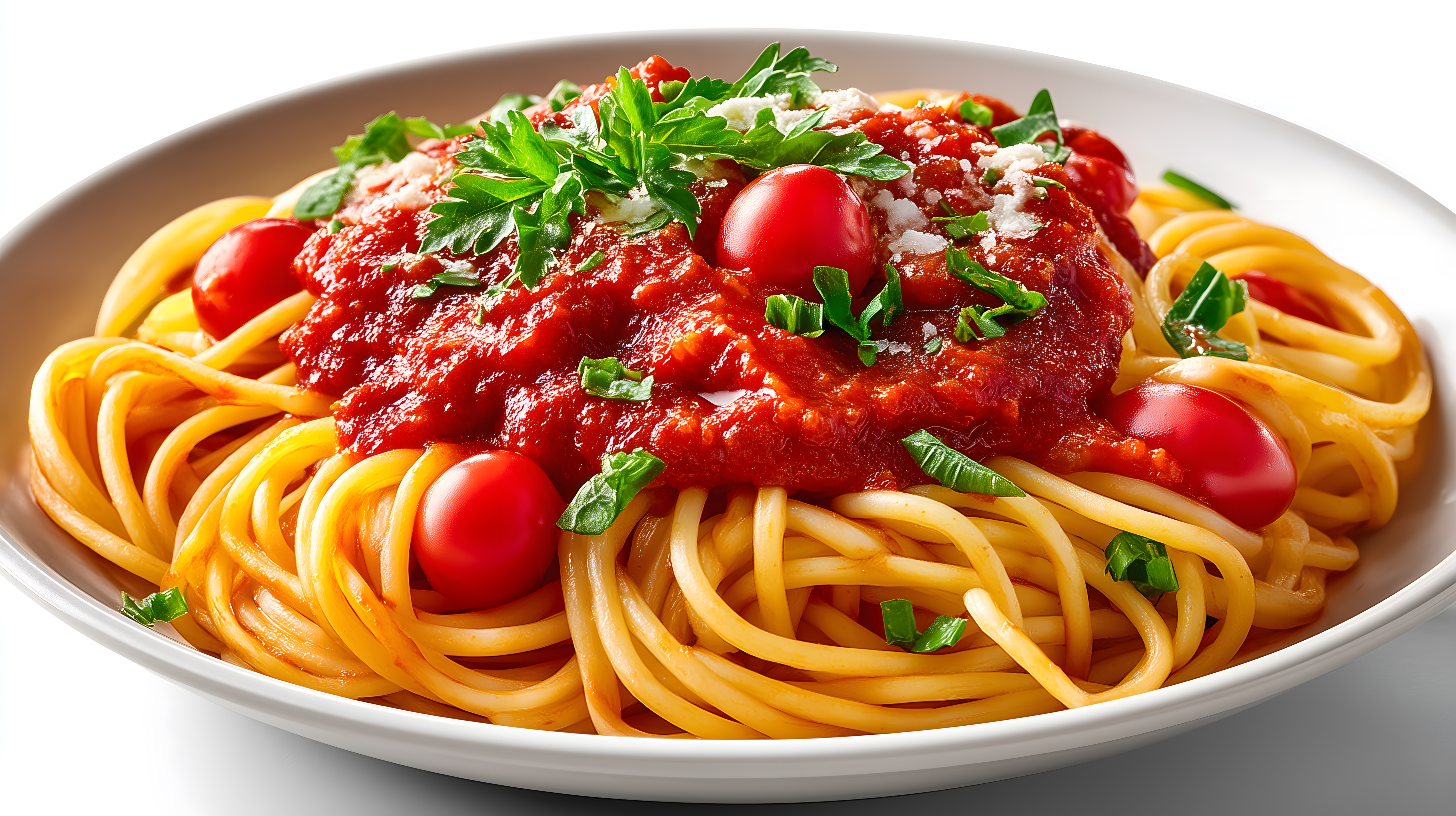 Spaghetti mit Tomatensauce und frischen Kräutern serviert