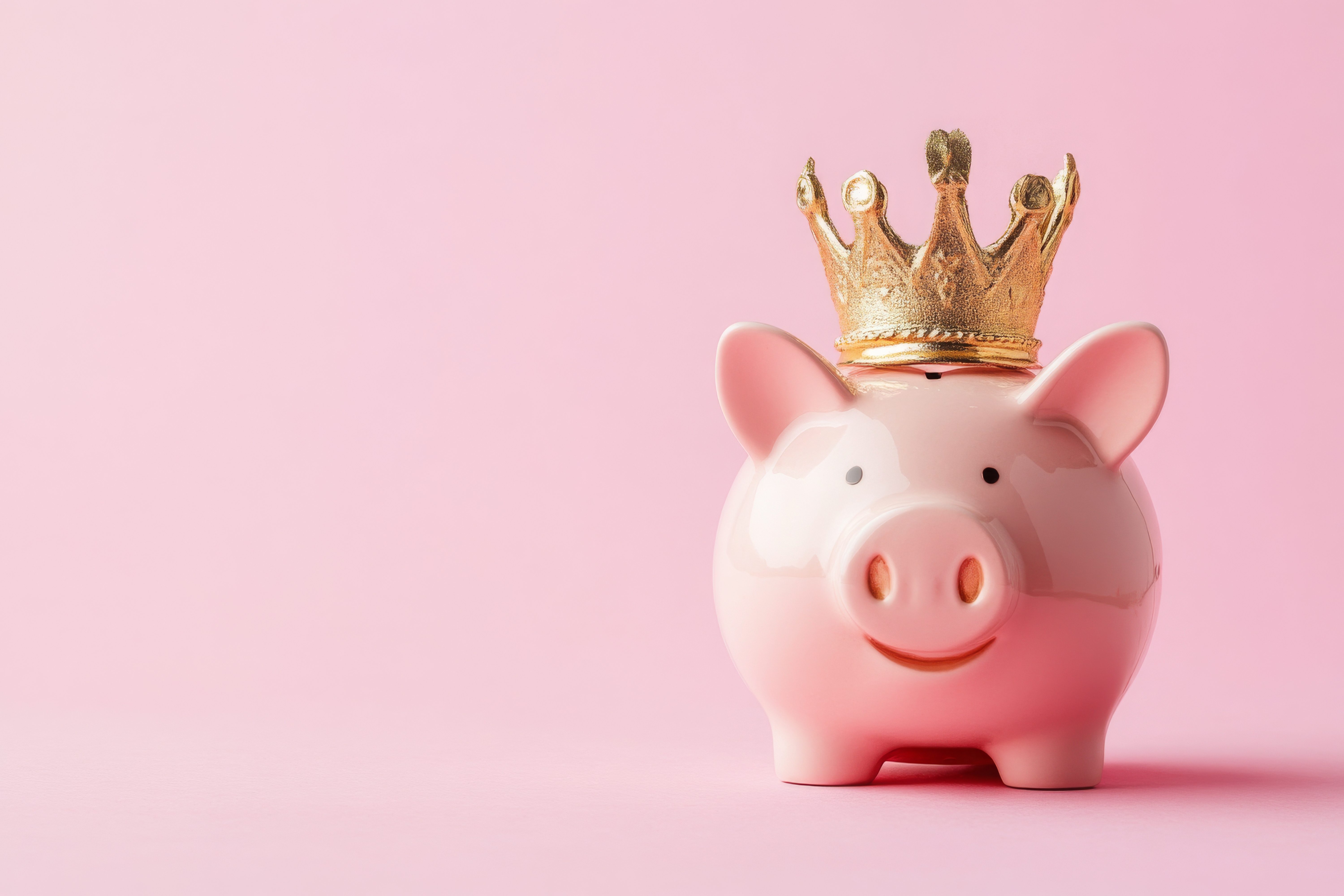 Sparschwein mit goldener Krone auf rosa Hintergrund