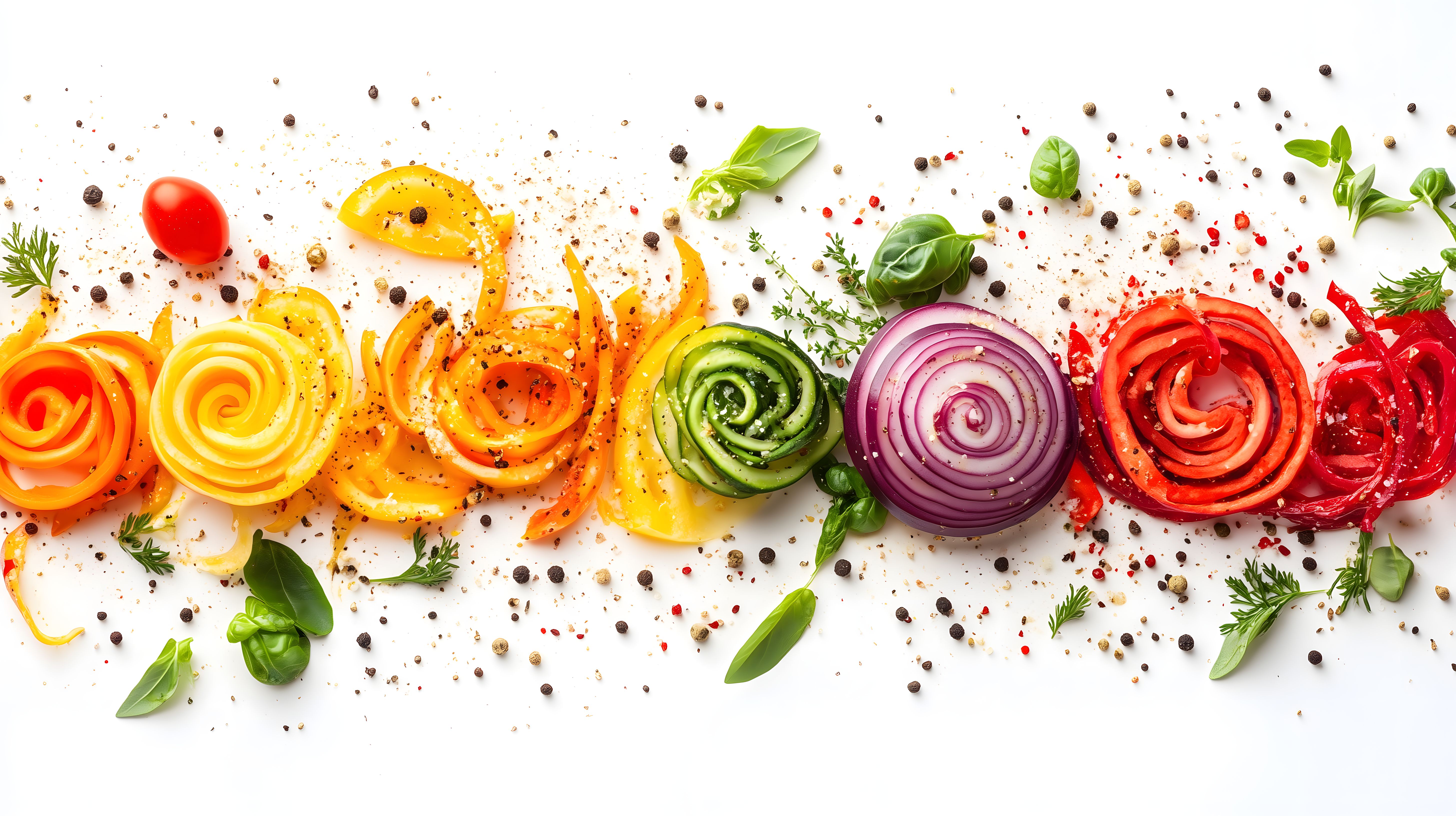Spiralisiertes Gemüse und Zwiebelringe in kunstvoller Anordnung