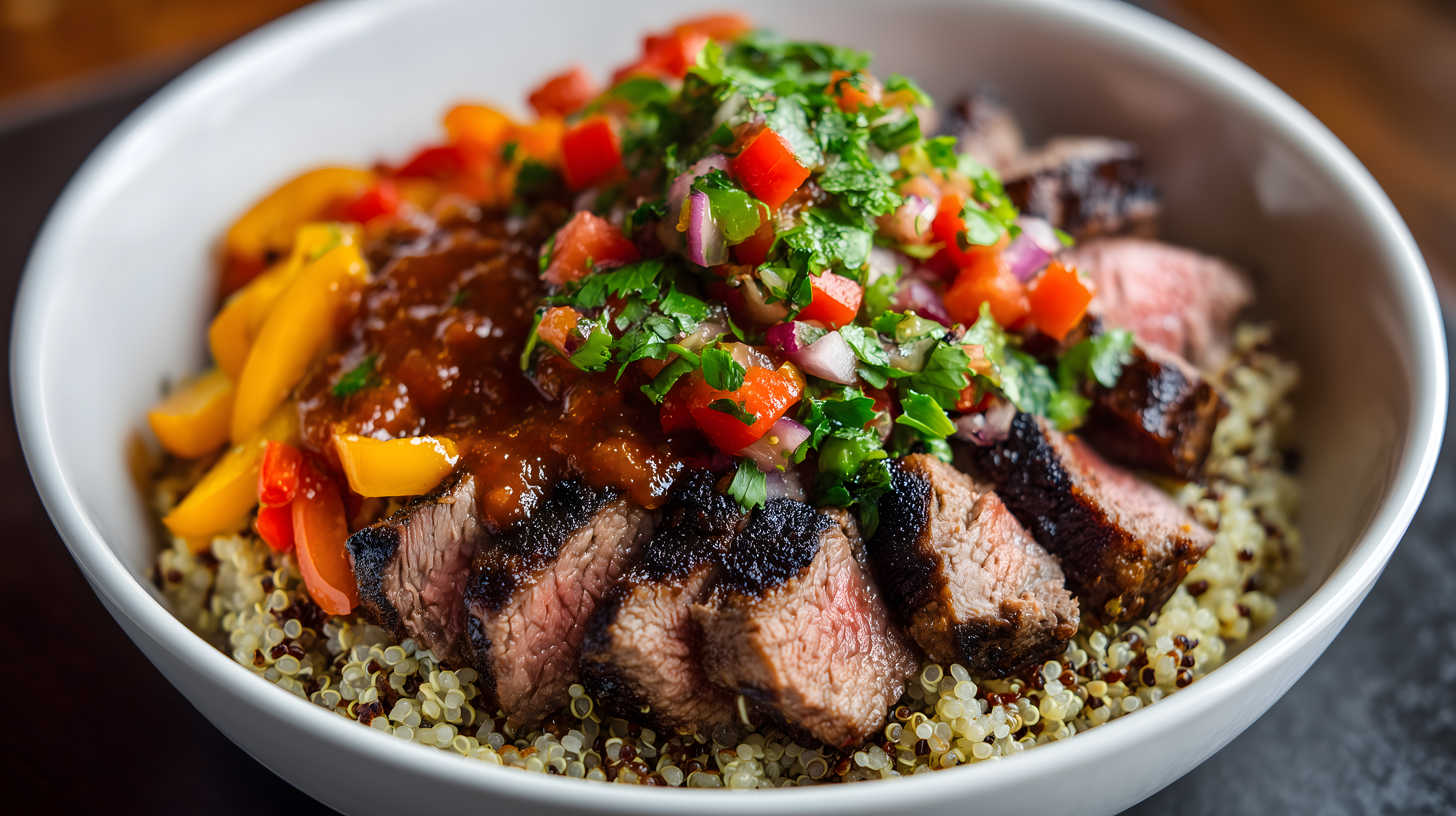 Steakbowl mit Quinoa und Paprika in Nahaufnahme