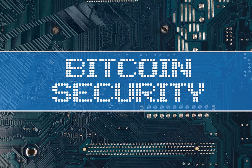 Text Bitcoin Security mit einer elektronischen Leiterplatte als Hintergrund