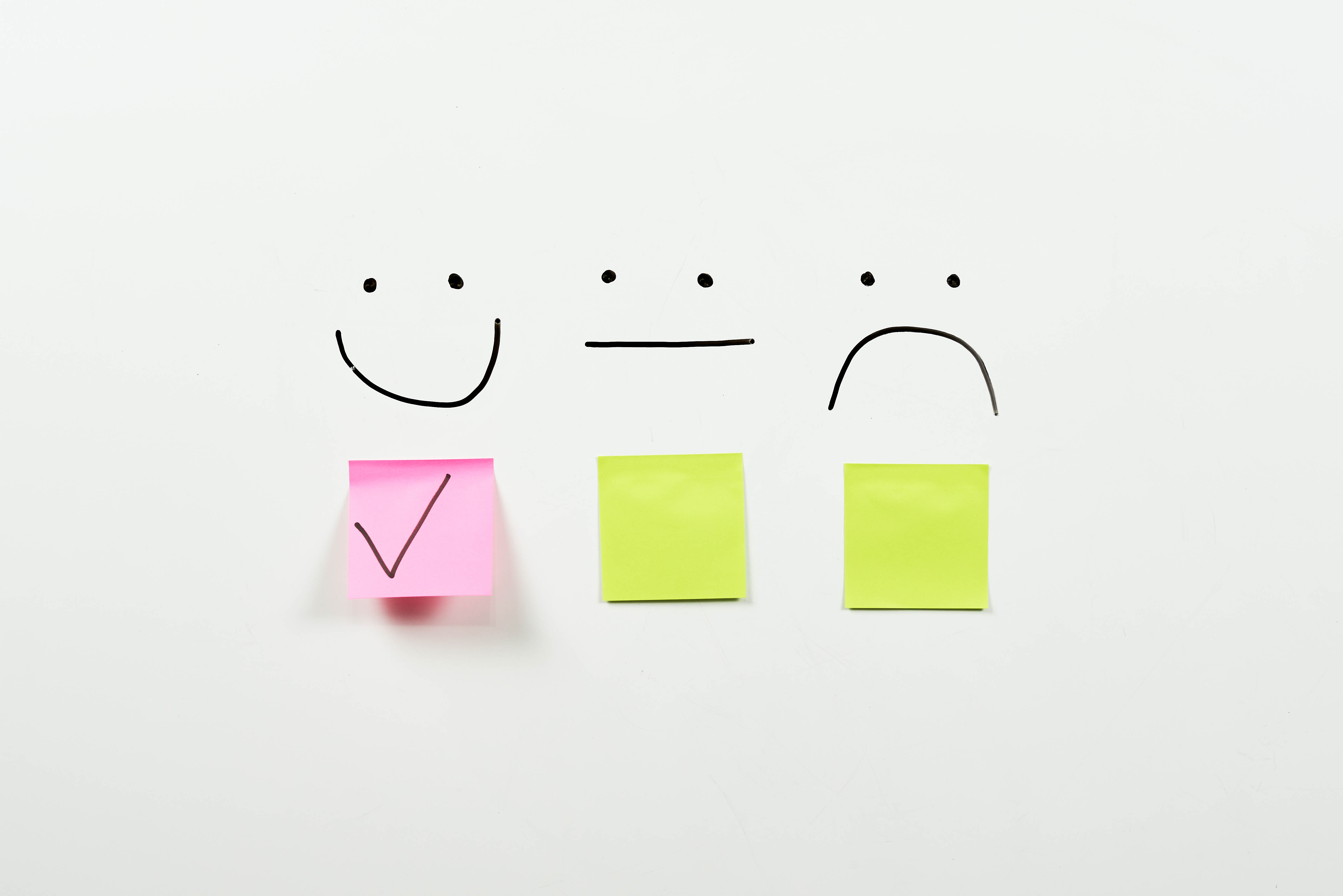 Three smiles on the whiteboard for rating the products or services. Customer review, feedback and satisfaction concepts