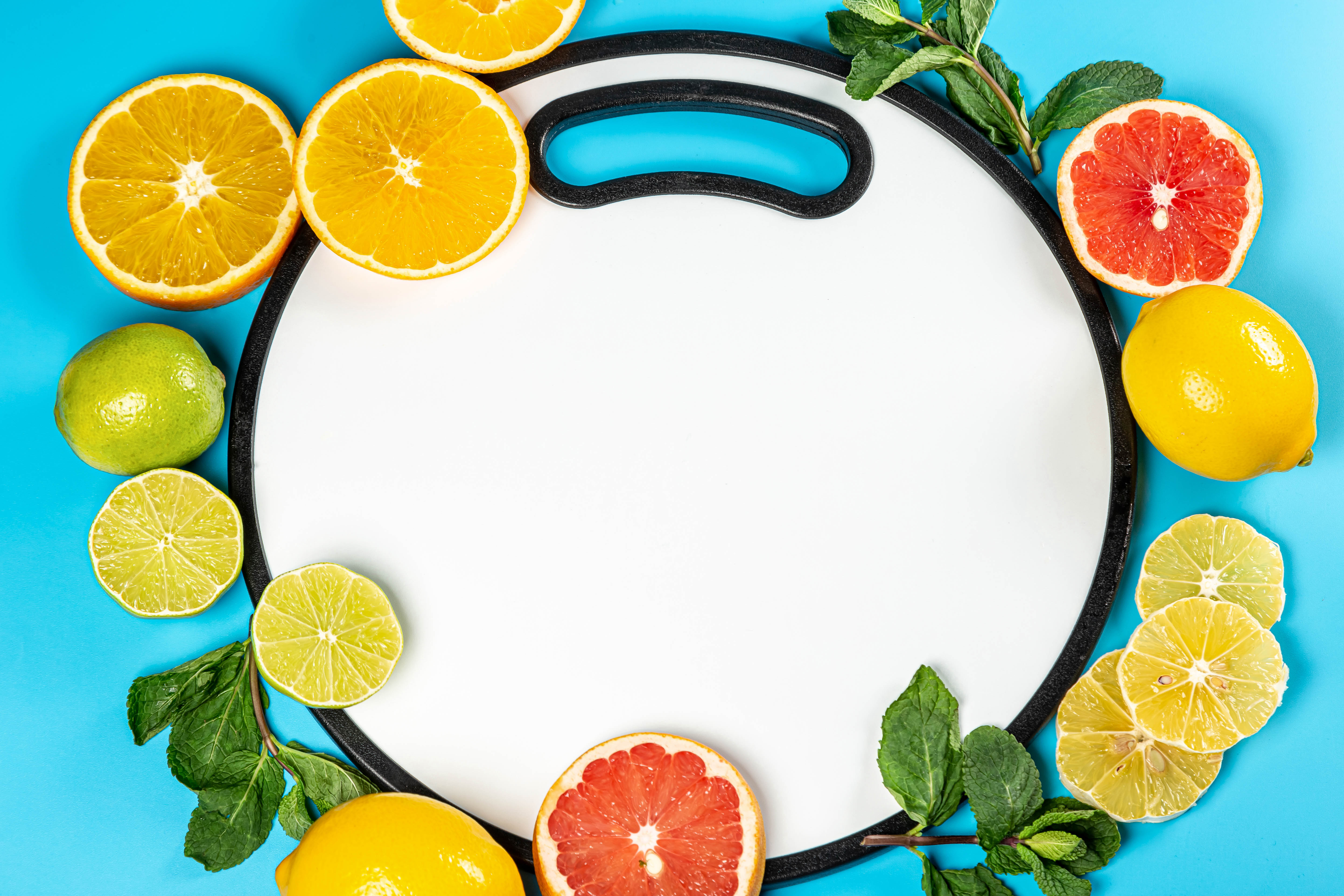 Top view, frame with fresh citrus fruits with mint on blue background with white kitchen board in the middle