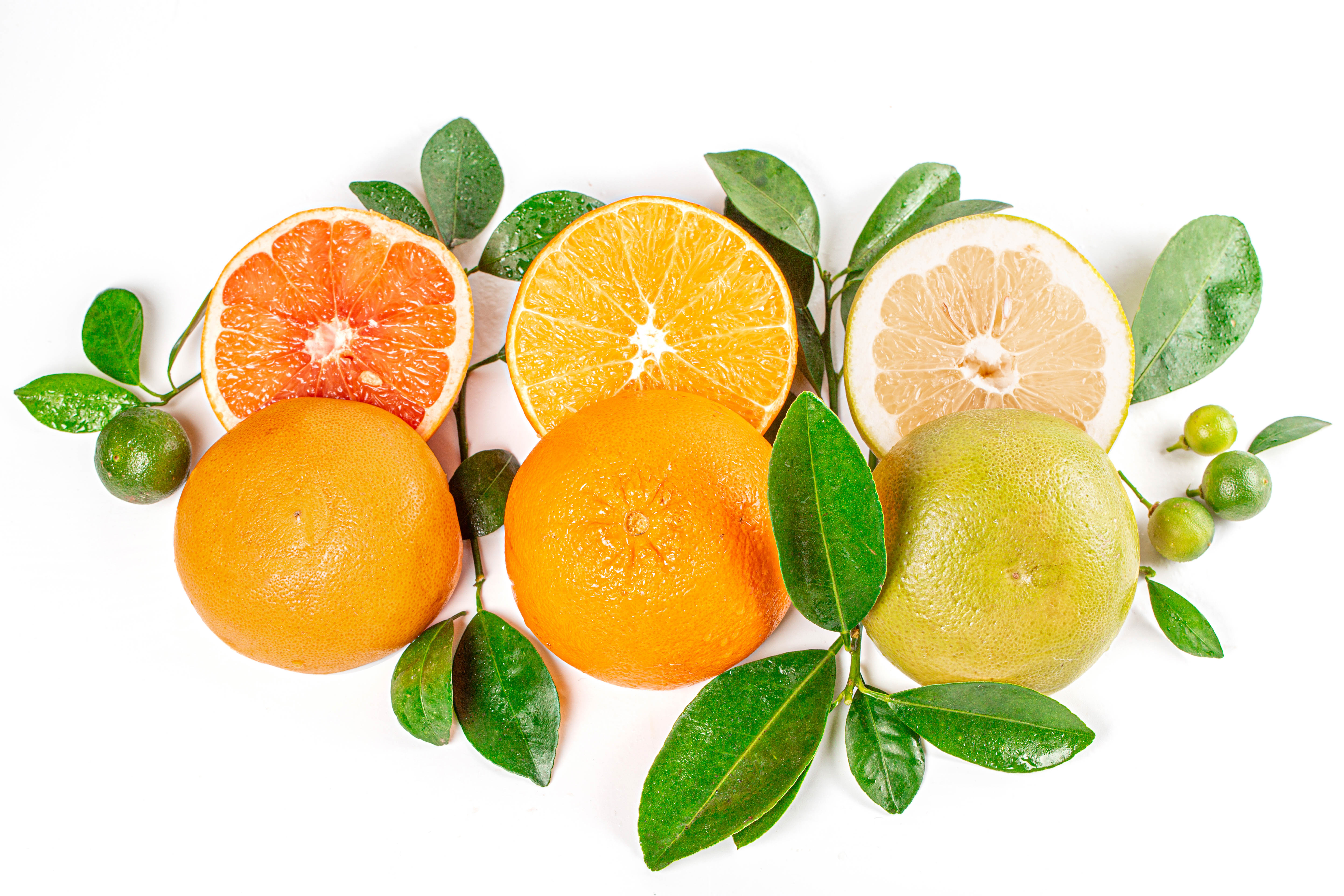 Top view of orange, sweetie, grapefruit and calamondina with branches