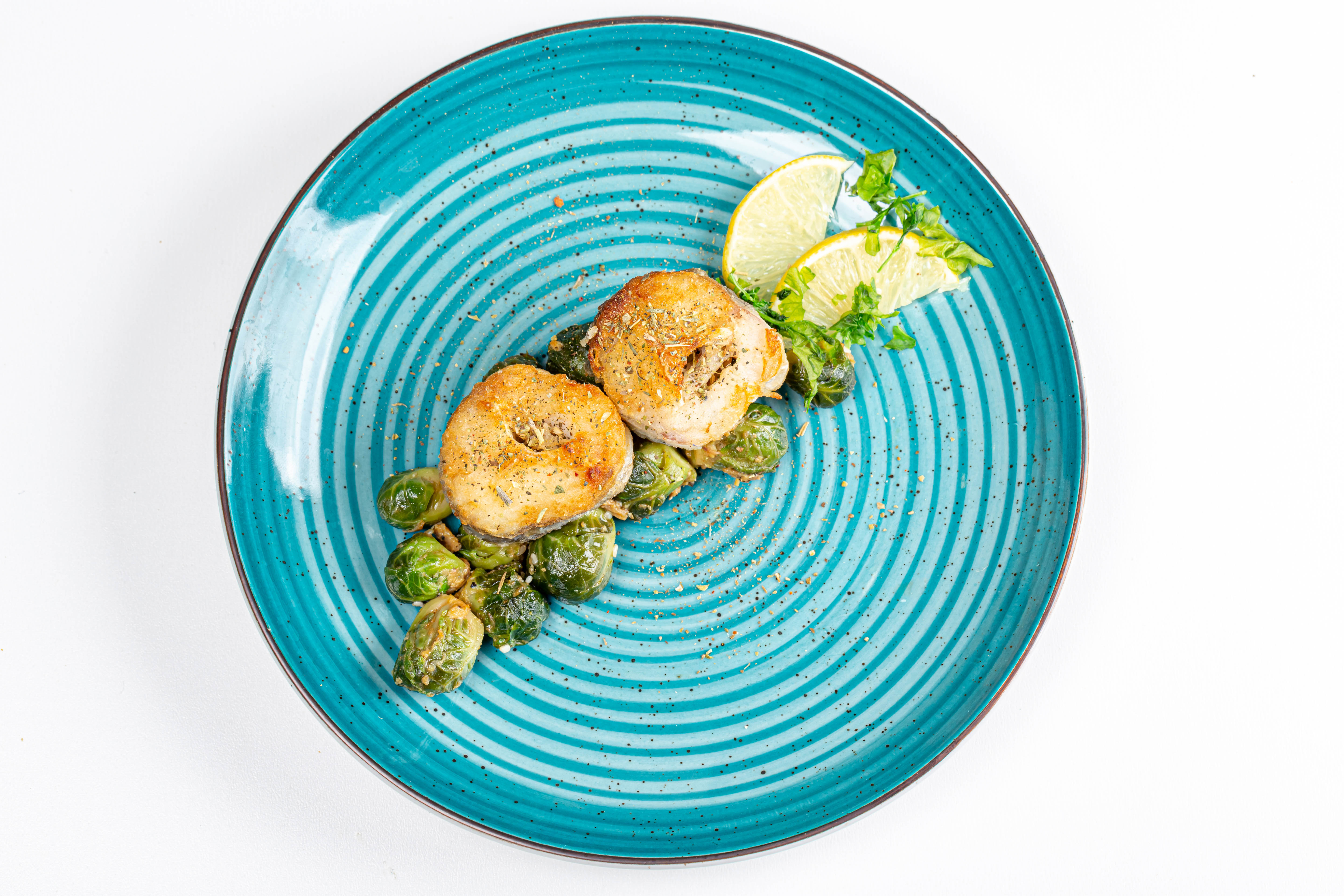 Top view slices of fried hake with Brussels sprouts
