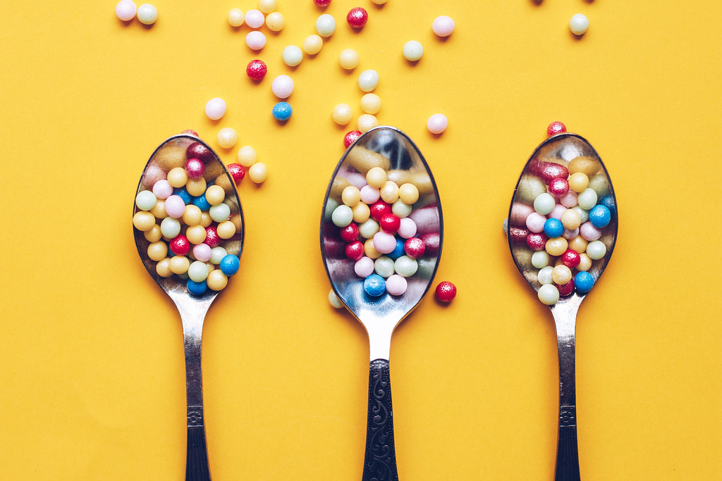 Top view three spoons with colorful sprinkles on yellow background.