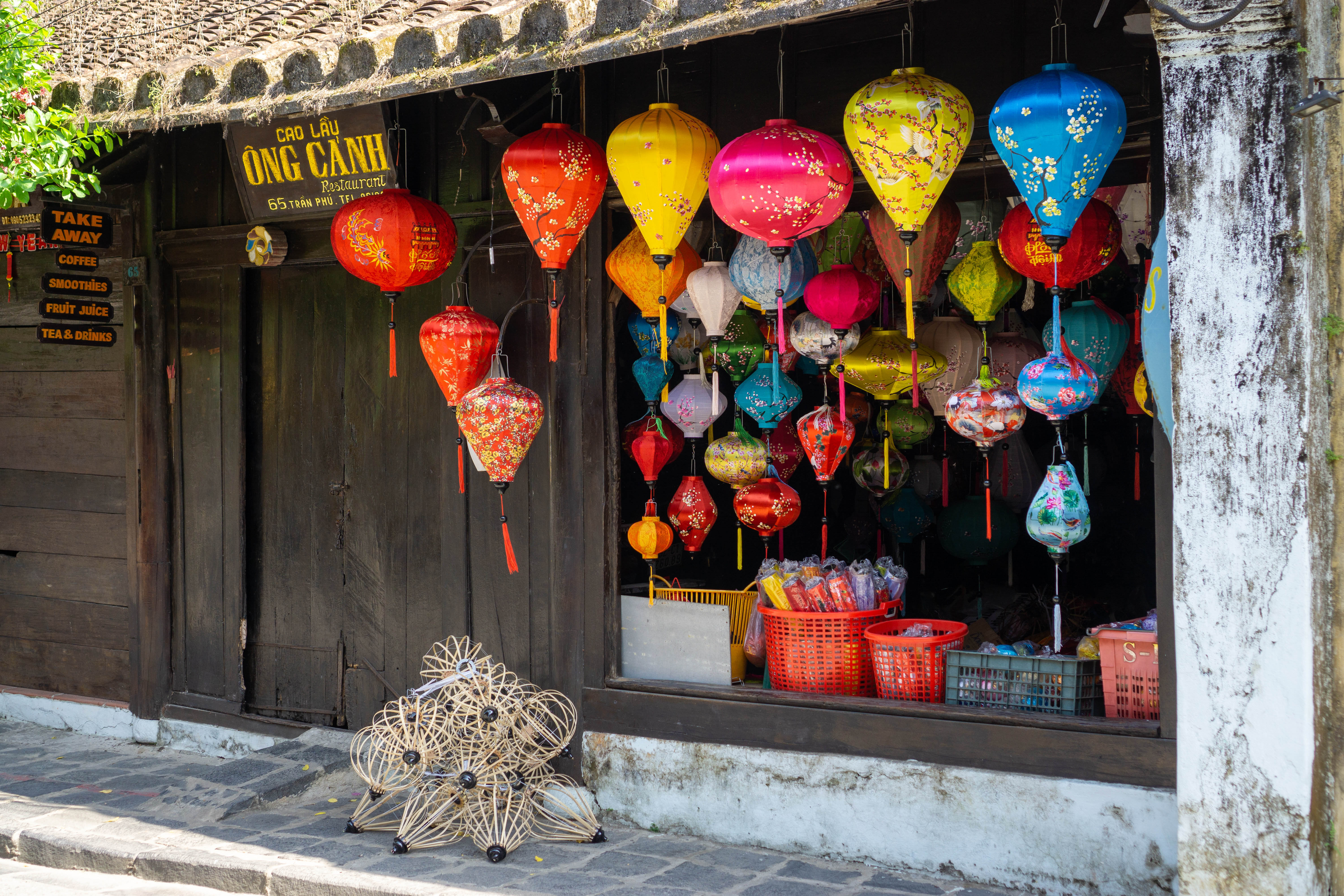 Traditional Restaurant selling Cao Lau with Small Souvenir Store selling Handmade Silk Lanterns in different Colors in Hoi An, Vietnam
