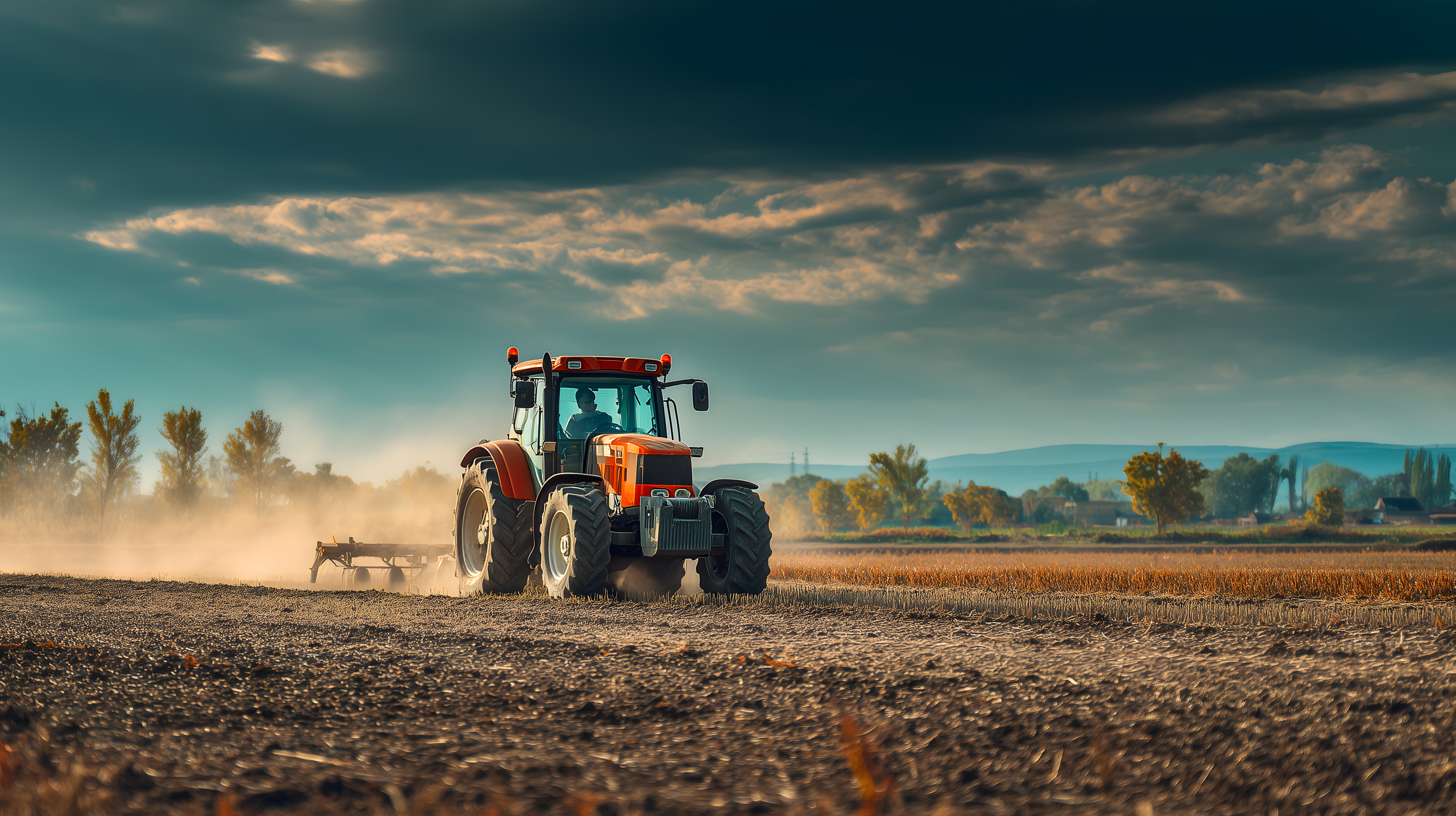 Traktor auf Acker bei Tageslicht während der Erntezeit