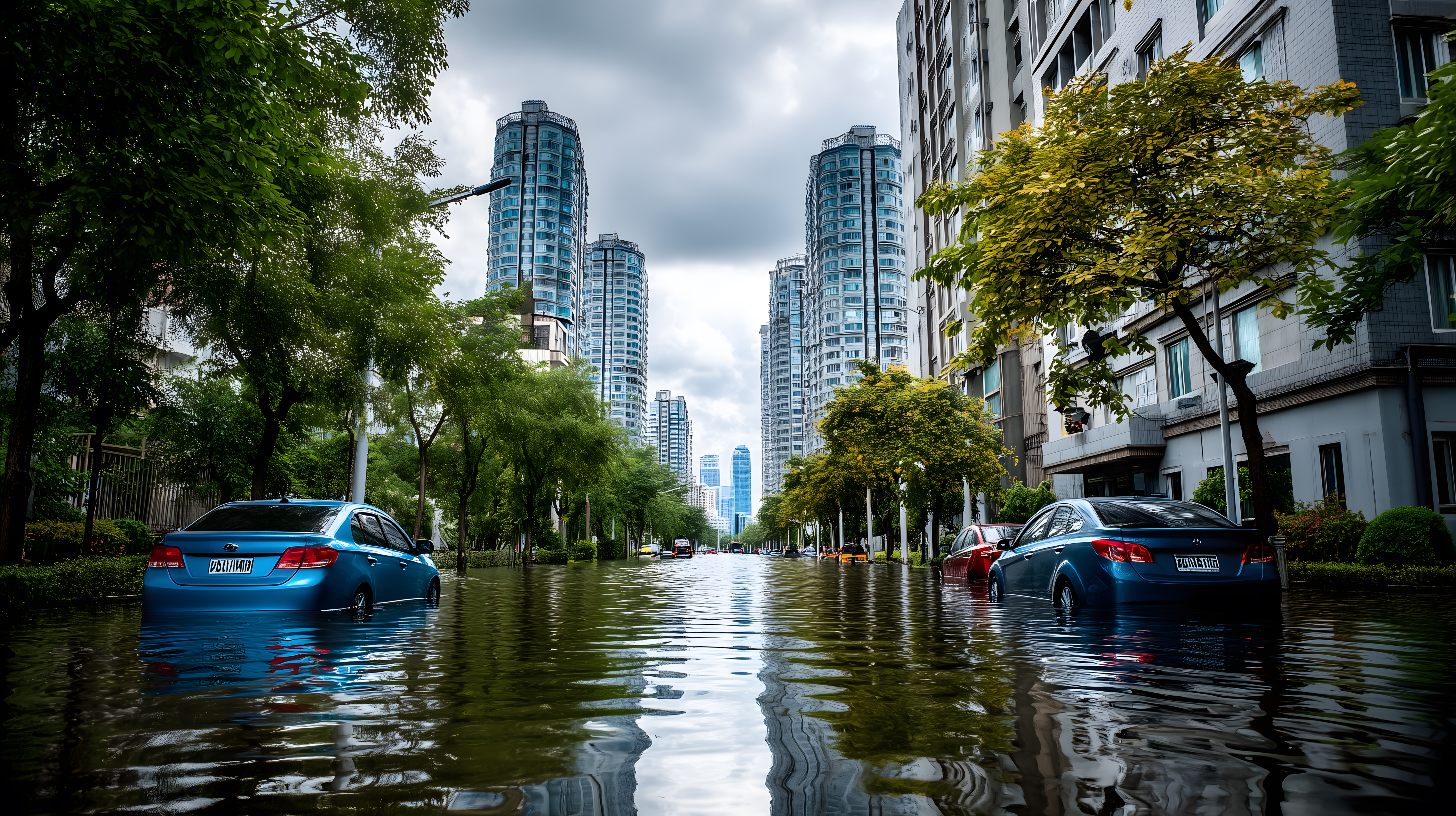 Überflutete moderne Stadtstraße mit teilweise unter Wasser stehenden Autos