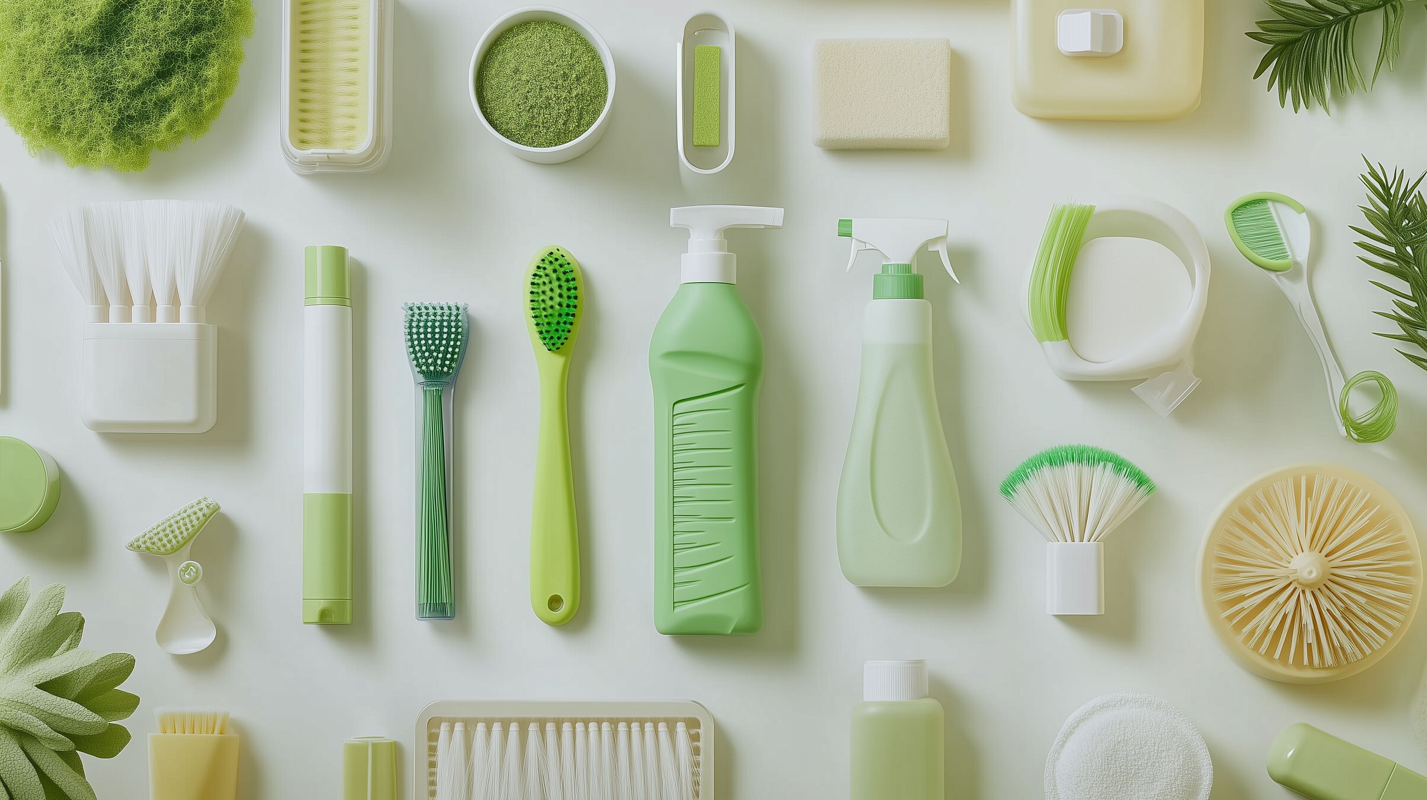 Umweltfreundliche Reinigungsprodukte in Grün und Weiß