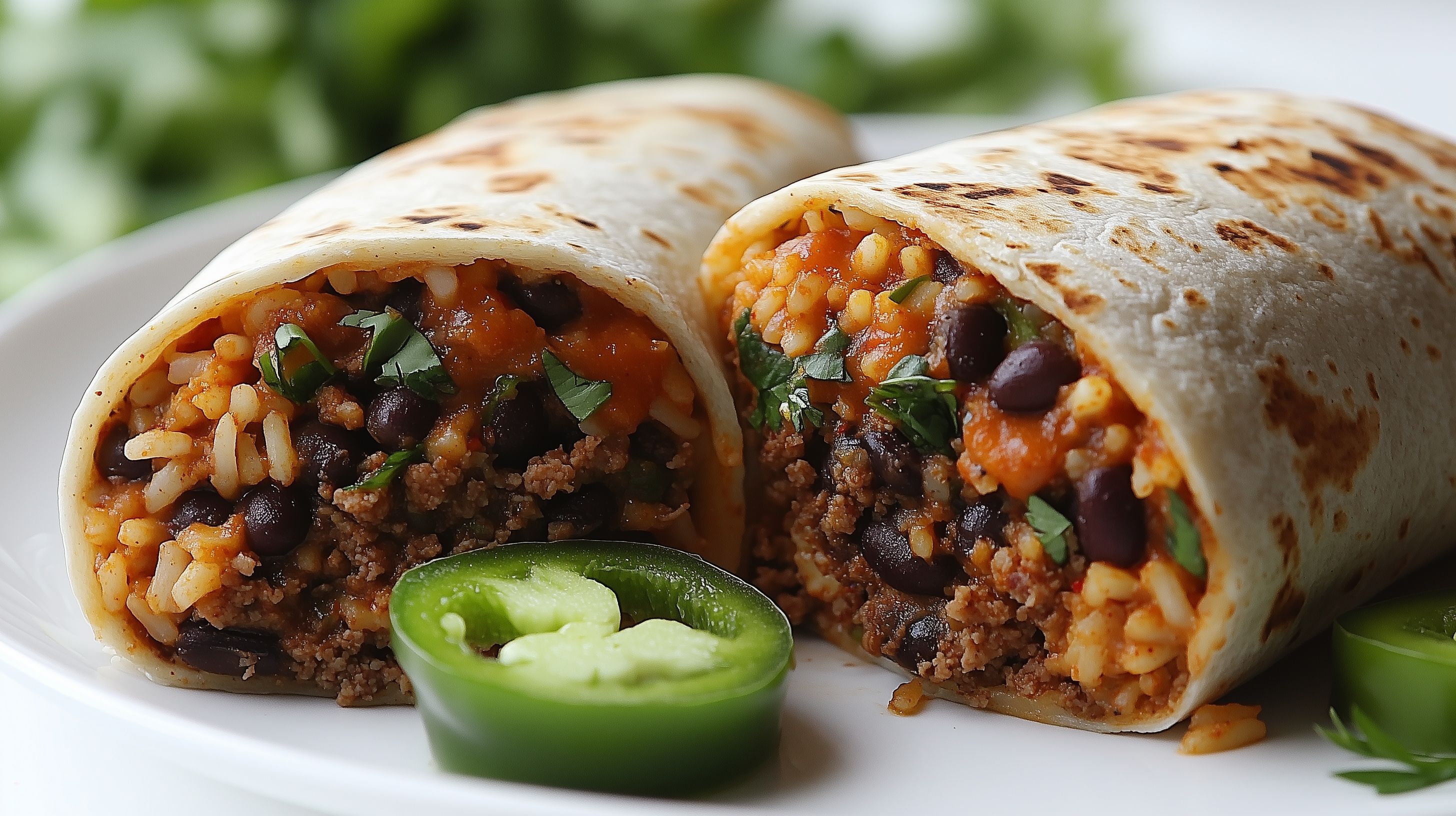 Veganer Burrito mit Reis, schwarzen Bohnen und Gemüse aufgeschnitten serviert