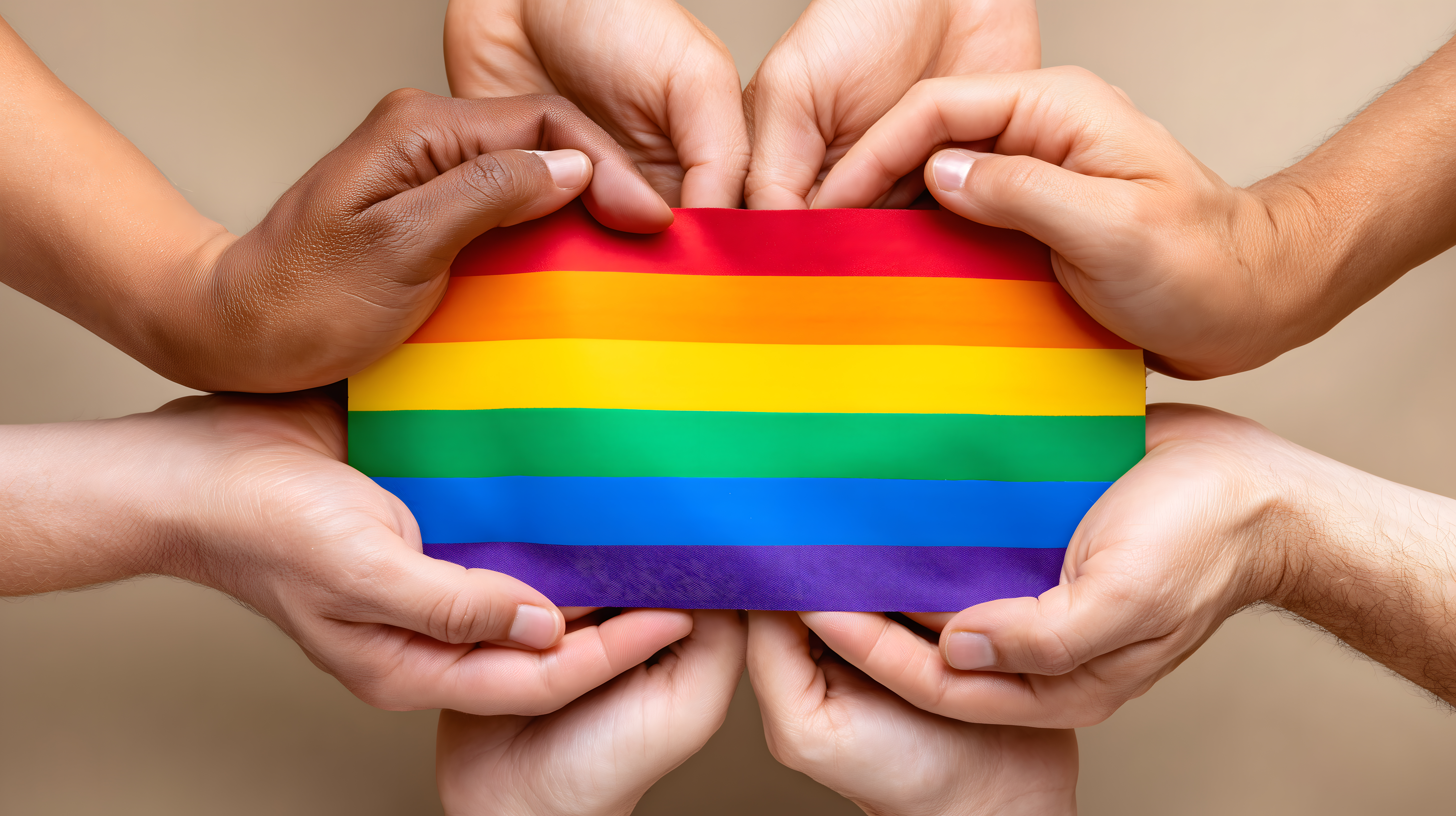 Viele Hände halten gemeinsam eine Regenbogenfahne