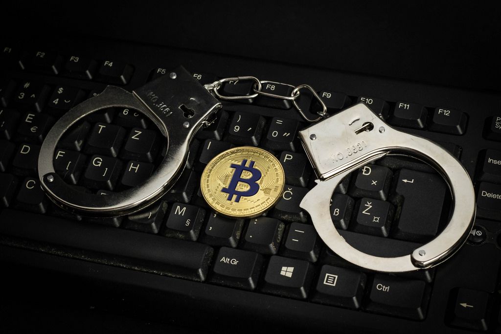 Virtuelle Gefangenschaft - Handschellen und ein Bitcoin auf einer Tastatur