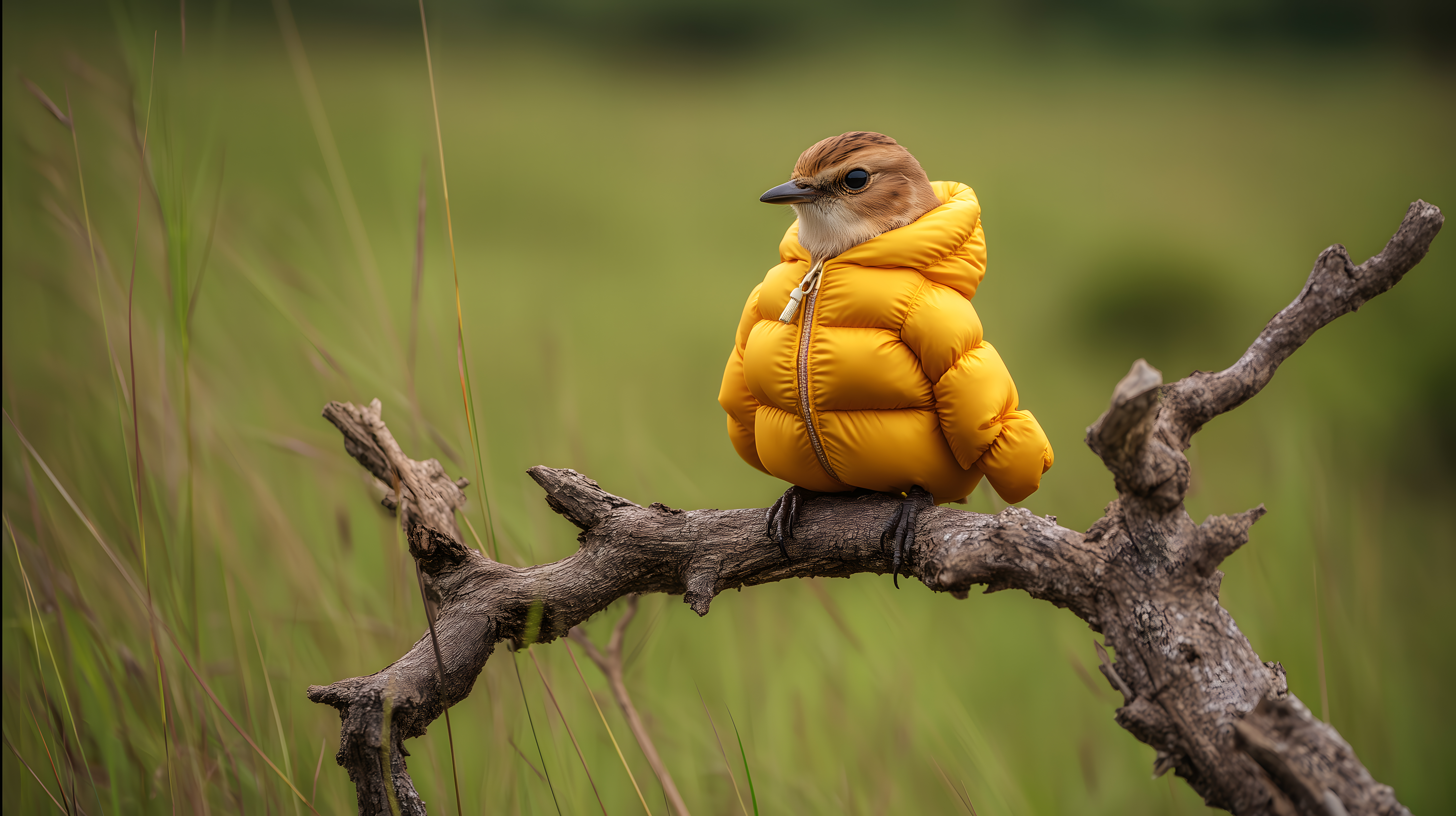 Vogel mit gelber Daunenjacke auf Ast